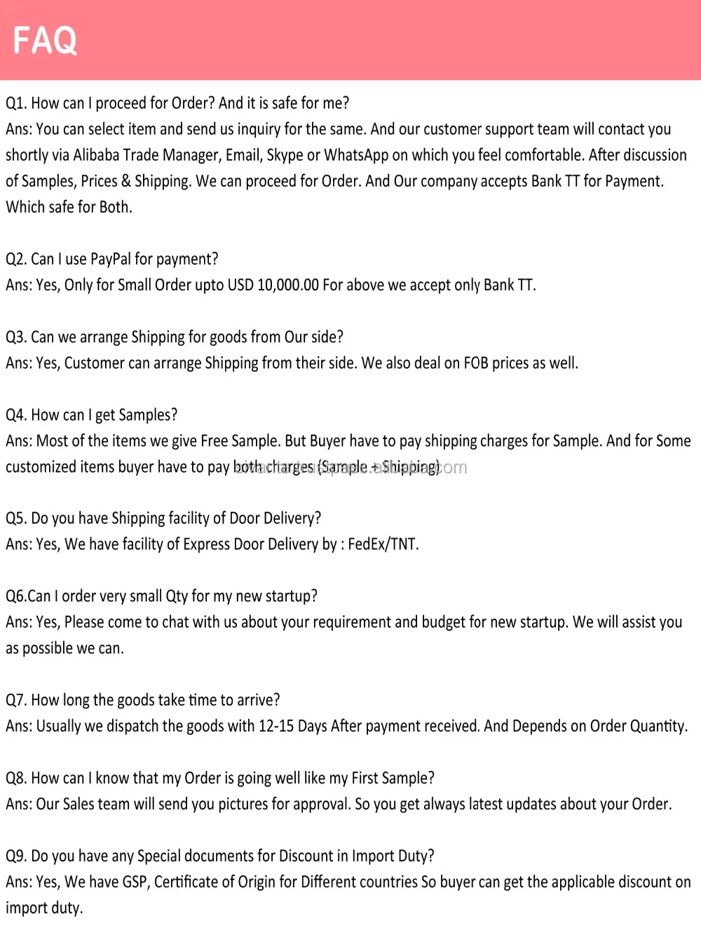 Shipping Type: | Air-Freight/ Sea- Freight/Express Delivery – FedEx/DHL. |
