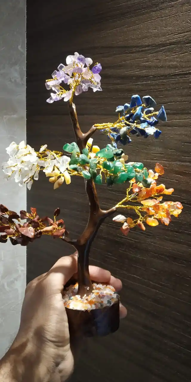 Using small crystal chips make a crystal tree.crystal tree are also available in all stone like that amethyst,ross quartz,lapis,crystal,black agate,red carnelian,red jesper,green aventurine etc...it also made withe 100 chips tree,200 chips tree,300 chips treee,500 chips tree and 700 chips tree.crystal tree made by 2 quality.1.with mcil and 2.without mcil.both type are available in moin agate and used Silver Wire Or Golden Wire.Making gemstone tree with wooden base.