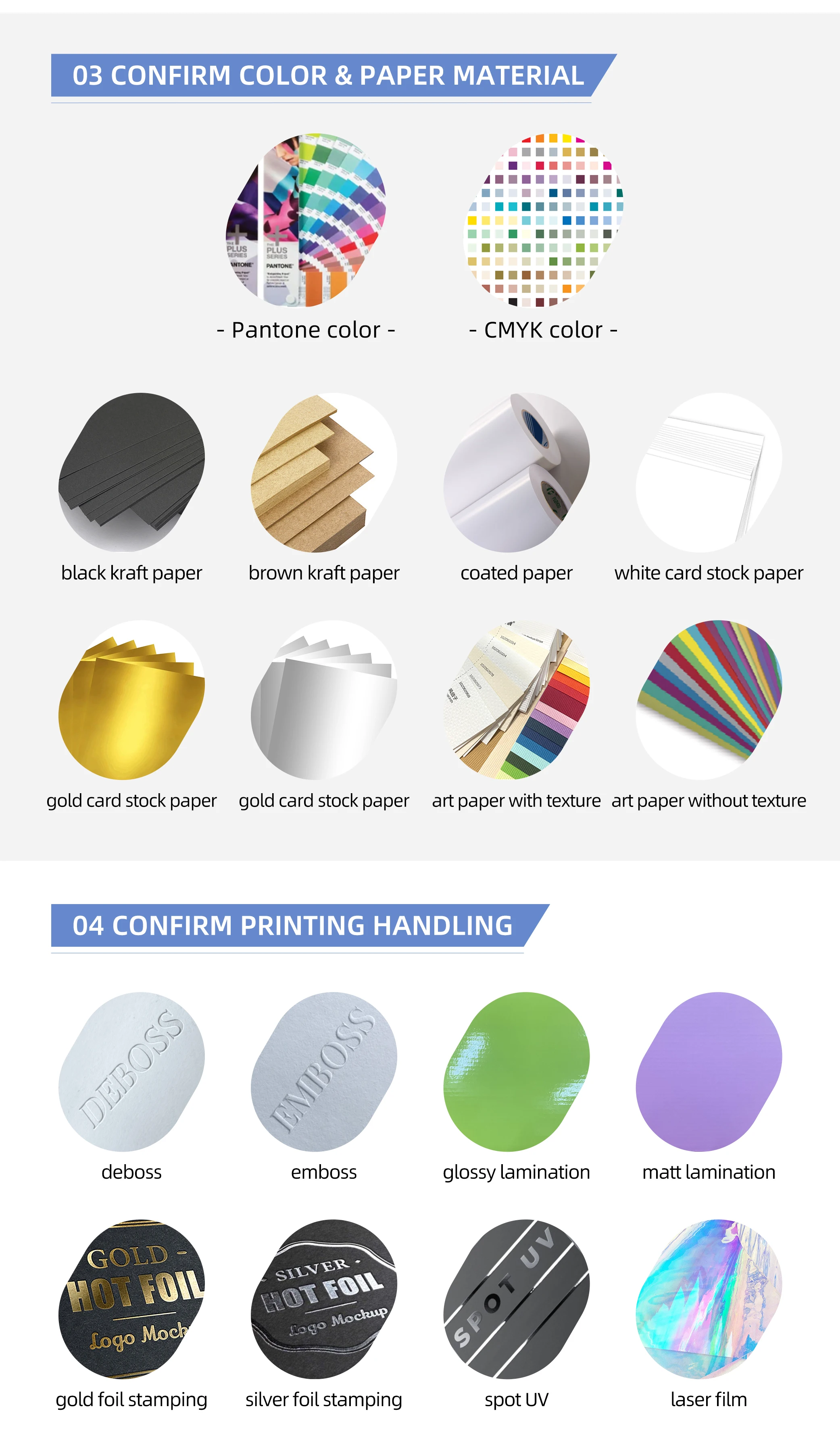 Printing Handling | Debossed or Embossed, Gold or Silk Foil Stamping, Spot UV, Laser Film, Glossy Lamination or Matt Lamination |