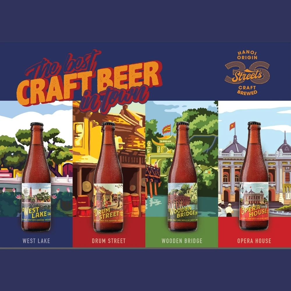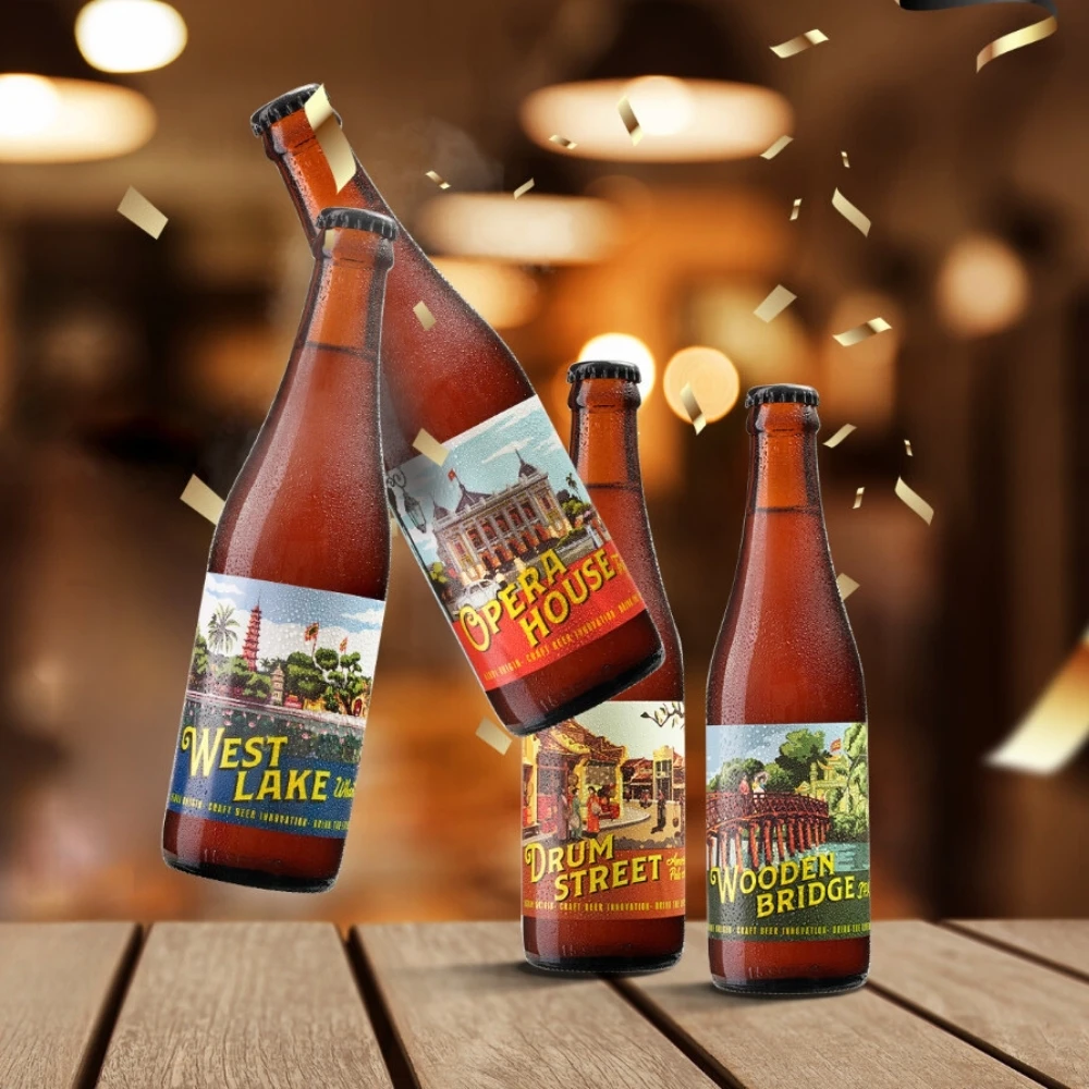 Flavor | - Craft Beer Wheat West Lake (5.4 % Alcohol) - Craft Beer Tripel Opera House (7.5 % Alcohol) - Craft Beer American Pale Ale Drum Street (6.3 % Alcohol) - Craft Beer IPA Wooden Bridge (6.9 % Alcohol) |