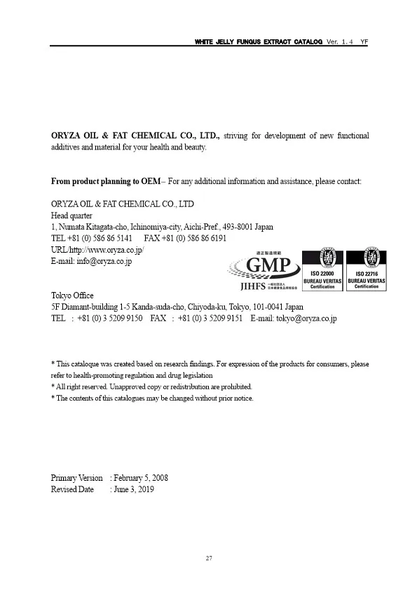 The main appeal points of WHITE JELLY FUNGUS EXTRACT are as follows. ・Suppresses hyperlipidemia ・Action to activate enzymes that metabolize sugars ・Interferes with fat accumulation (in vivo) ・Interferes with fat absorption ・Lowers triglyceride and cholesterol levels ・Promotes bile acid secretion ・Promotes the growth of Lactobacillus and Bifidobacterium