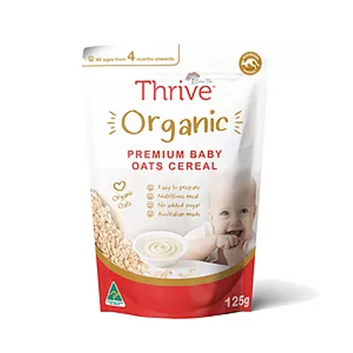 Thrive Organic Premium Baby Oats Cereal is available in a range of plain oats or with fruit or vegetables added for extra flavour.