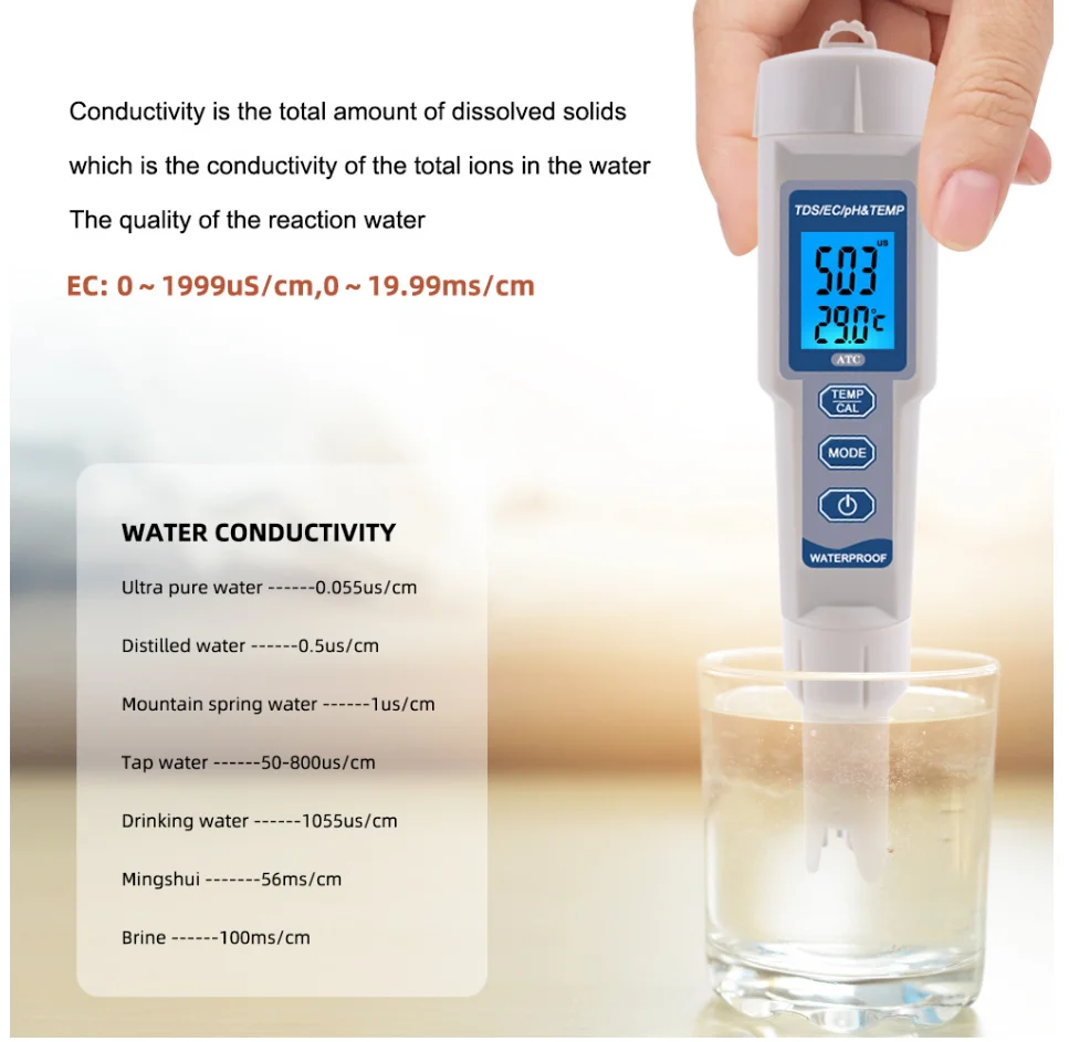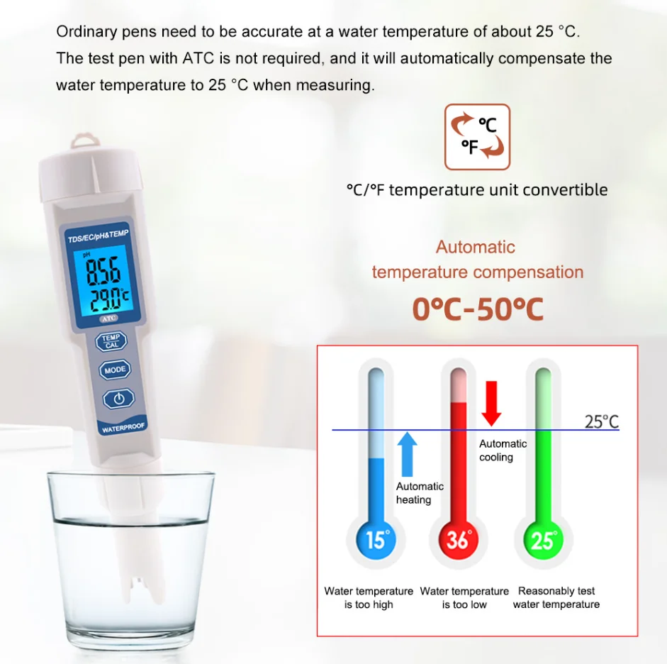 Digital 4 in 1 PH TDS EC TEMP Meter Pool Aquarium Hydroponics Drink Water Quality Analyzer Conductivity PPM Tester Specifications: Measuring range: pH:0.00-14.00pH; TDS: 0-19990ppm; EC: 0-19990muS/cm Resolution: 0.01 pH; 1ppm; 1muS/cm; 0.1℃; 0.1degF Accuracy: pH: +/-0.01 pH; TDS/EC: +/-2%; Temp: 0.5℃ Batteries: 3 * 1.5V LR44 button cell (not included) Temp.: 0.1-60.0℃; 32.0-140.0℉ Calibration: pH: three points automatic calibration (6.86 & 4.00 & 9.18pH); TDS: 1413muS/cm; EC: 1413muS/cm Auto shut off: 5 Minutes FAQ: Q1: Does the product include batteries?What is the batteries number? A1: Batteries can be removed and sent,we will negotiate with you how to place the battery. The battery model is LR44, which can be purchased from local stores A2: The product shall be corrected before leaving the factory. If the error is found to be large, it shall be corrected. For example, the ph of the measured tap water is generally between 7-8, which means no correction is needed A3: The product shall be corrected before leaving the factory. If the error is found to be large, it shall be corrected. For example, the ph of the measured tap water is generally between 7-8, which means no correction is needed |