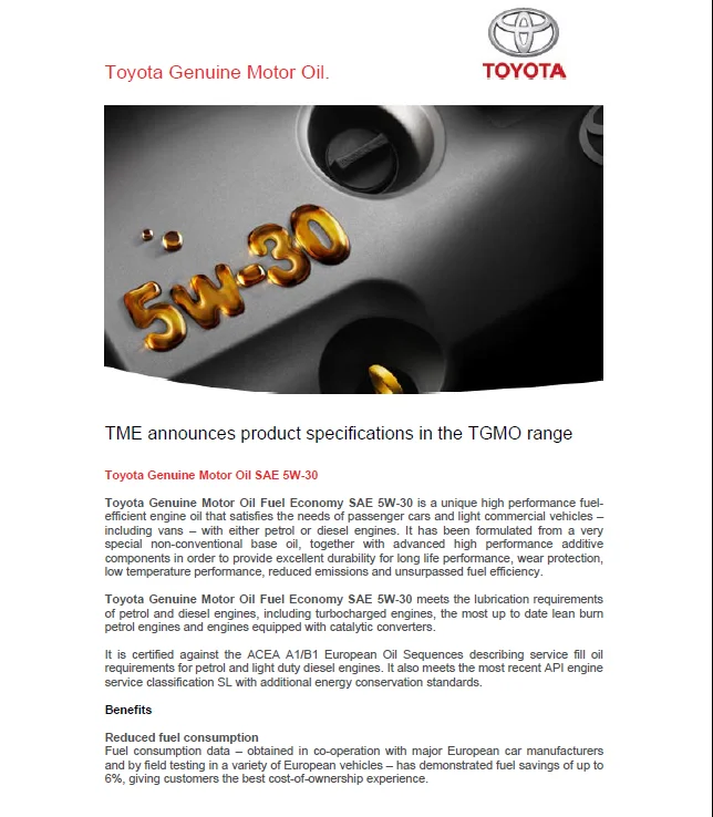 Toyota Genuine Motor Oil Fuel Economy SAE 5W-30 is a unique high performance fuelefficient