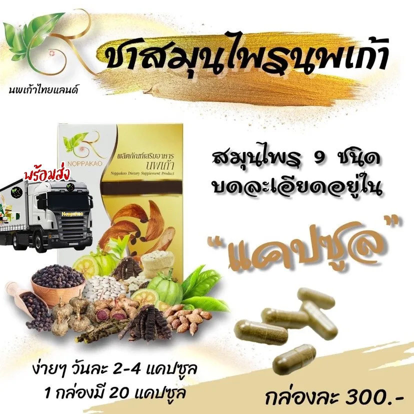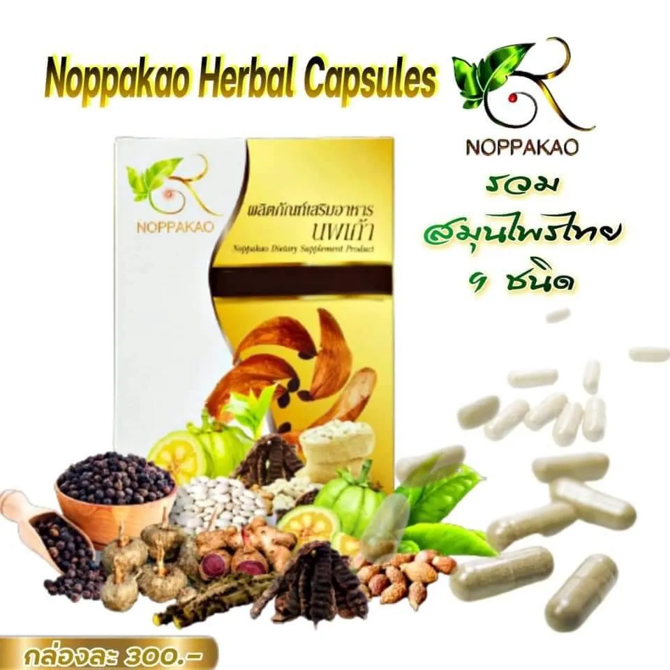 With the properties of all 9 herbs in Noppakao Herbal Tea, the widely accepted capsule type is white kidney bean, malva nut, black pepper, black galingale, green tea, Tinospora crispa, senna, soap pod, konjac.