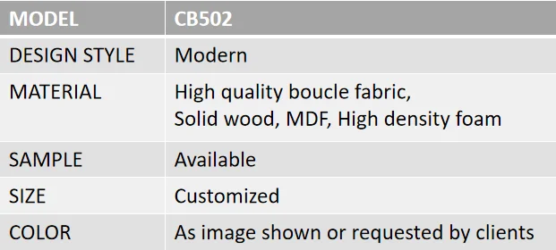 2. Materila: MDF+plywood Bed Frame/ Quality Foam Sheet 3. Tufted Headboard/ Solid wood leg base/ High quality boucle fabrics/ Improved internal structure