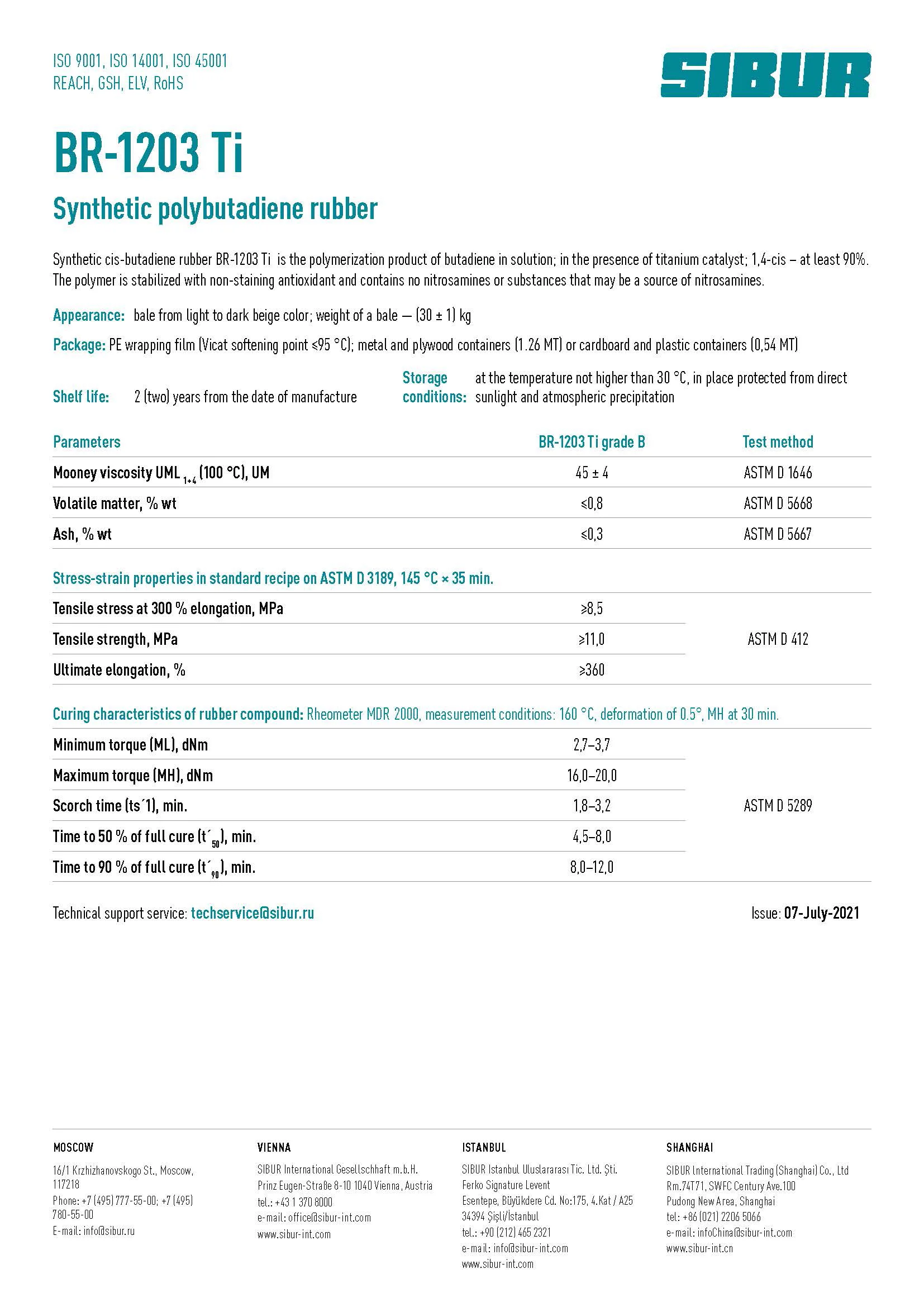 Synthetic cis-butadiene rubber BR-1203 Ti is the polymerization product of butadiene in solution; in the presence of titanium catalyst; 1,4-cis - at least 90%. The polymer is stabilized with non-staining antioxidant.