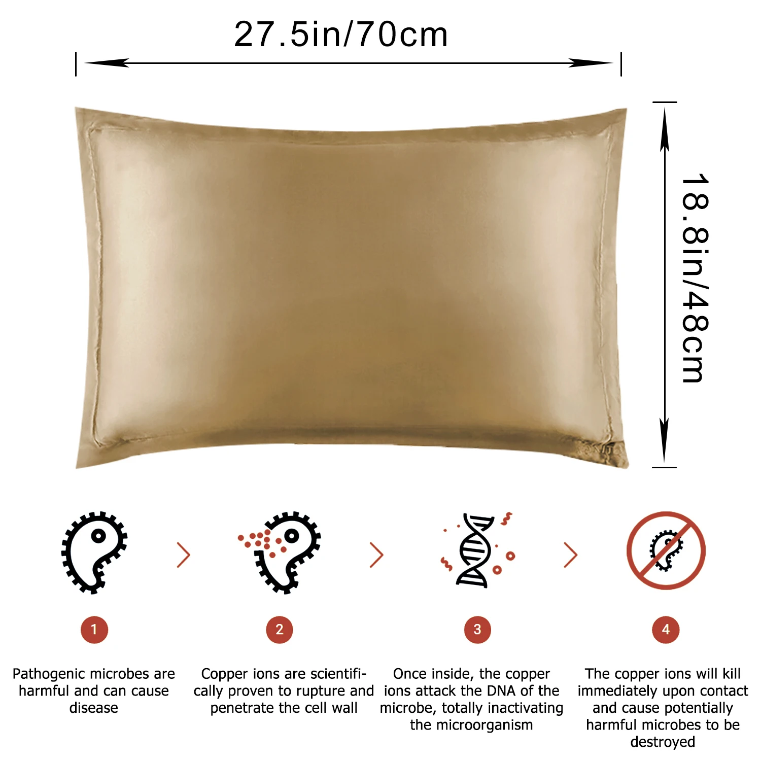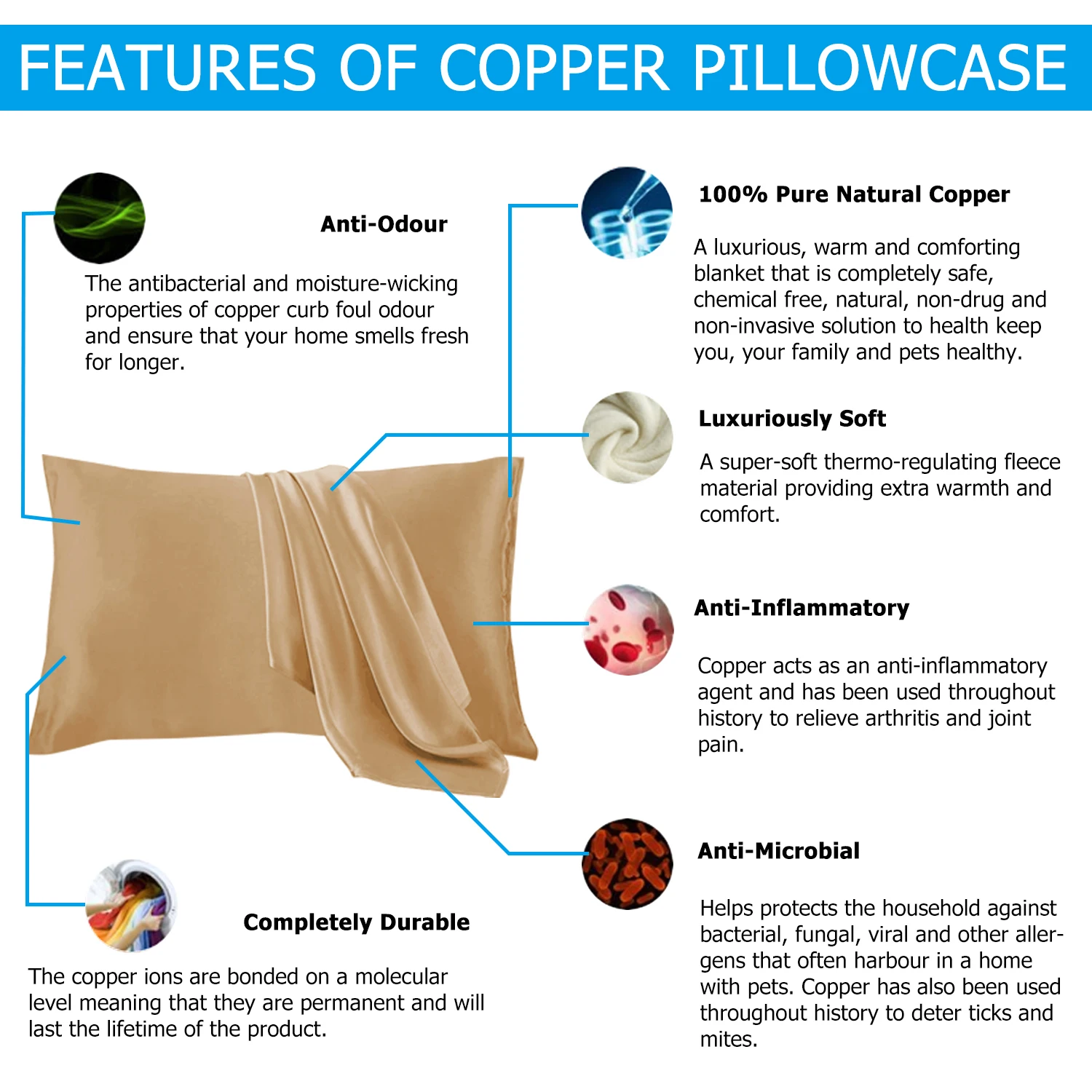 Features: * Hypoallergenic. * Naturally Derived Minerals. * Copper fiber helps reduce odors. * Copper pillowcase fabric feels like smooth, supportive silk on your face. * Copper destroys the cell and helps control them from growing in your bed. * Copper pillowcase promote blood circulation, reduces Signs of Aging, diminishes Wrinkles, minimizes Fine Linesto keep skin rejuvenating.