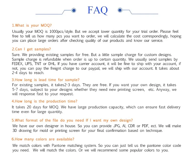 *MOQ | 500-1000-2000-3000-5000-10000-20000 pcs depend different size ,item,design and process. | |
