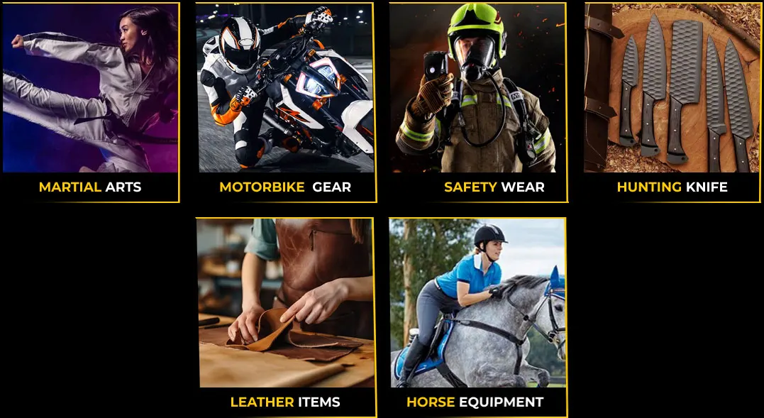Casual Wear, Fitness Wear, Sports Wear, Leather Products, Boxing Equipment's, Martial Arts Wear, Motorbike Wear, Safety Wear, Hunting Knife, Horse Equipment's