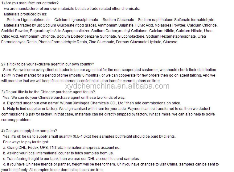 с помощью и доверие со стороны долгосрочное сотрудничество клиентов за последние несколько лет, XYD Промышленной Компании постепенно становится назначен Китайский агент по закупкам из старых клиентов. из-за хорошей репутации конкретных примеси материалов (лигносульфонаты натрия, кальций лигносульфоната, глюконата натрия и ОЯТ), все больше и больше покупательной задач приходят от клиентов, так XYD Промышленности Ооо быстро вырастает из чистого производителя в производстве трейдера. сейчас это один из крупнейших продаж агент многих химических производств в Китае.