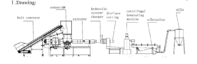 этот тип переработки линия состоит из погрузчик, агломератор (или дробилка), экструдер, гидравлические смены экрана, плесень, воды кольцо резки системы, обезвоживание системы сбора, воздух, дующий и хранения системы и т. д.