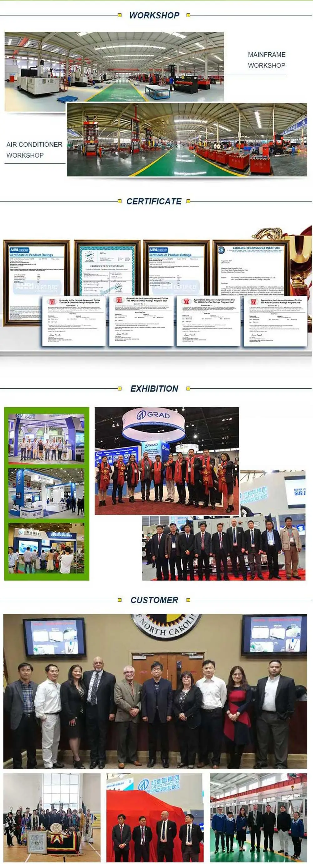 Shandong GRAD Group Co., Ltd. В 1993 г., находится в Dezhou Shandong, площадь территории 700 тыс. кв. м, с более чем 2500 сотрудников. Общий капитал составляет 925 млн. RMB, и годовой объем производства превышает 2,5 млрд. RMB. В течение 20 лет развития, ГРАД групп концентрируется на центральной кондиционировании и комплексе материалов продуктов и показывает мир высоко- технологическое предприятие, объединяющее бюджет строительства, технические консультации, проектирование, производство и отладка сервиса. Есть 10 серий, более 130 видов продуктов, охватывающих всю центральную серию кондиционирования и изделия из комплекса материалов серии. Рабочее рабочее совещание высокого уровня, охватывающее 350 тыс. квадратных метров.