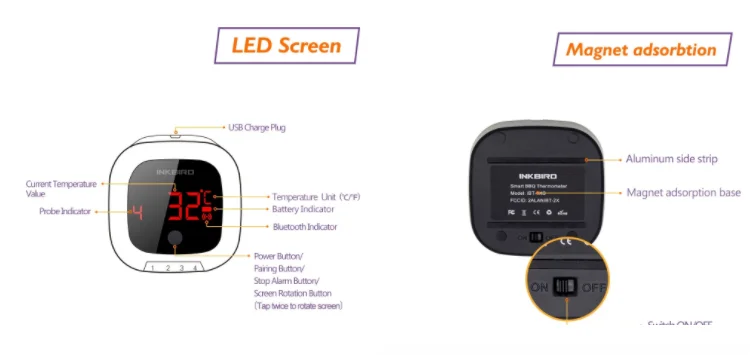 Inkbird IBT-4XS-это цифровой термометр bluetooth, который построен в 1000 мАч Li-Battery, магнитное и вращение чтения функции экрана.