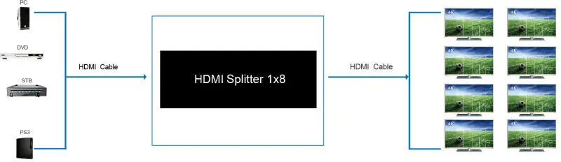 1. Один входной сигнал HDMI разделен на восемь устройств HDMI для раковины