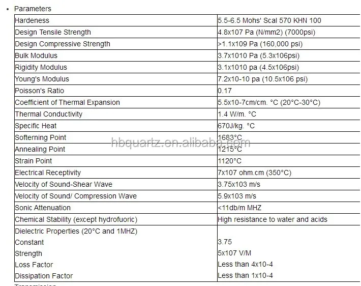 Свойства материала кремнеземной кварцевой пластины: