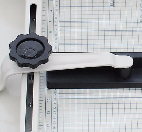 5. нажмите зажимной рычаг, чтобы закрепить бумагу, прежде чем нажать на ручку лезвия. Перед выпуском бумаги убедитесь, что ручка снова заблокирована.