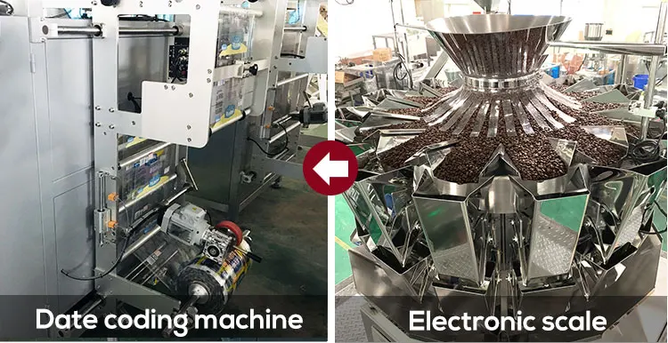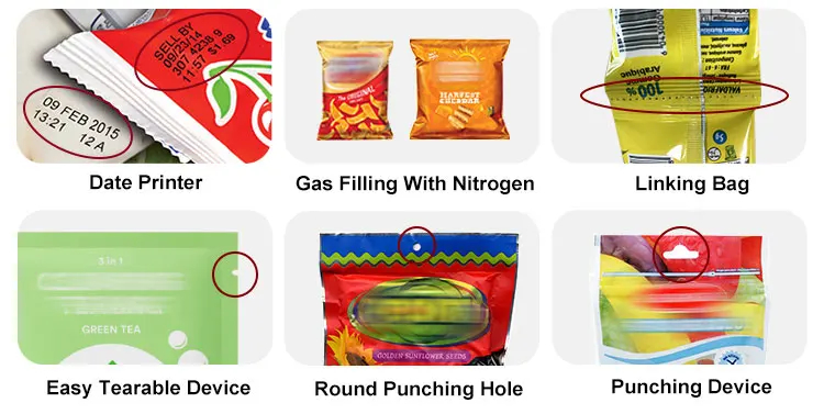 The packaging machine has date coding, fills the package with nitrogen, makes the linking bag, makes the easy tearing and punches the package.