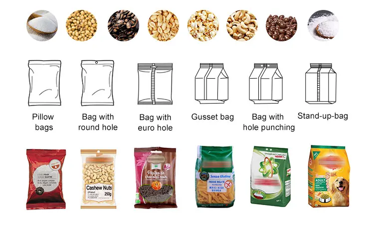 Product application > What do you want to pack? Fill free-flowing grains, pulses, seeds, salt,coffee beans, maize, nuts, candies, dried fruits, pasta, vegetables, snacks, pet food, low weighing engineering products and many more.
