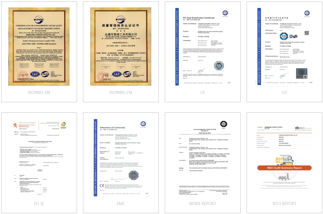 Chuntao has built the complete production lines of chain saws and brush cutters, and based on its advanced technical and equipments and continuously improved production process, our company can supply high quality products to all users. From the material in-storage to semi-finished products to finished products, our QA engineers control and guarantee the products strictly, which ensures the quality of every product. At the same time, our company is engaged in the innovation of our products and getting close to the world class level. So that we can develop the competition level of our products in the market and meet the various needs of the customers.