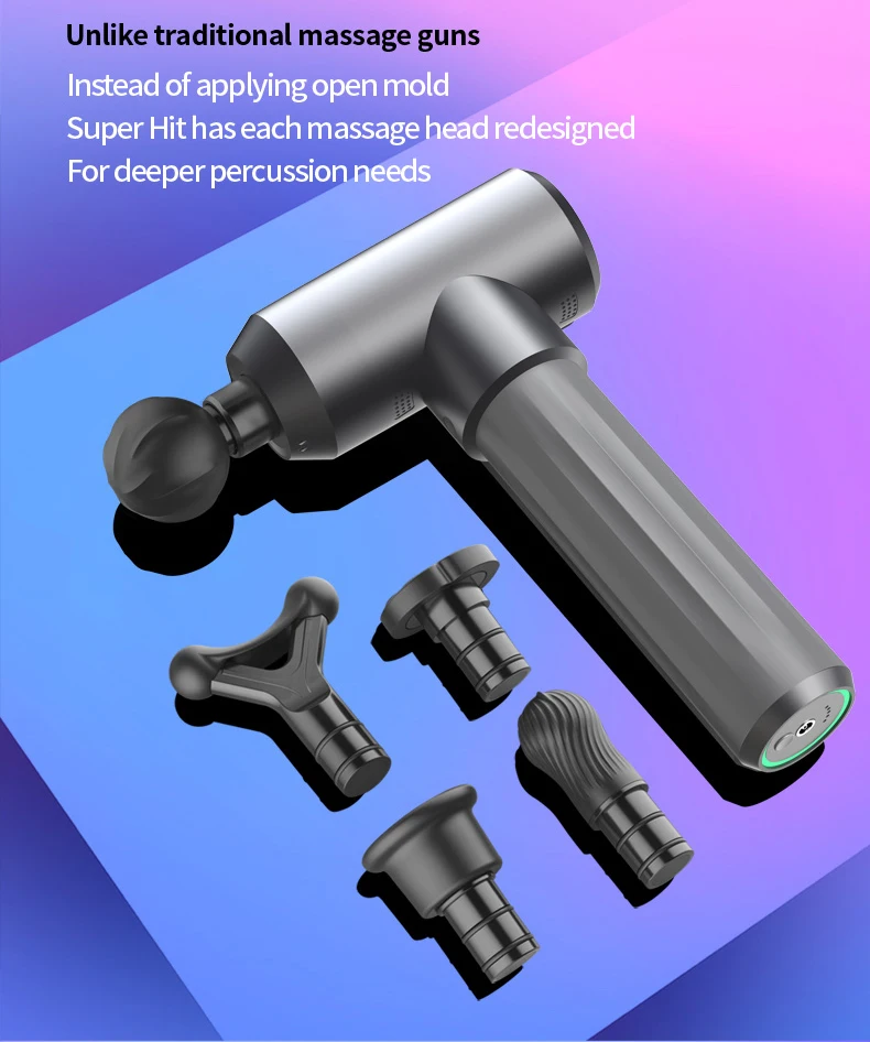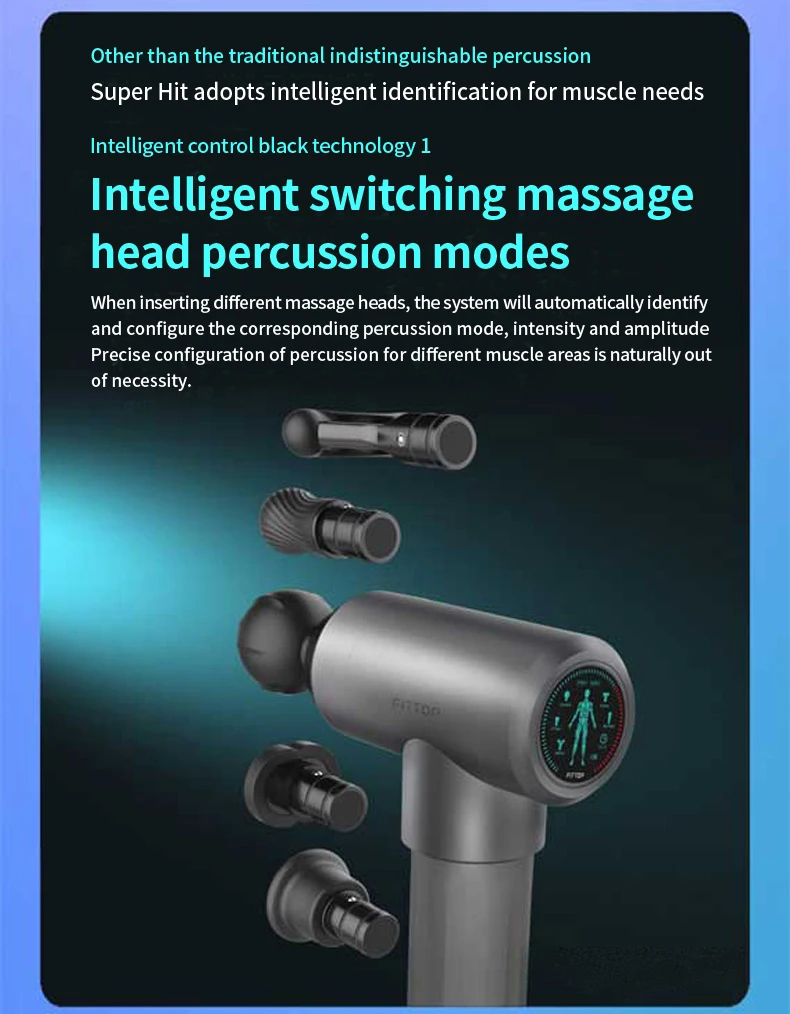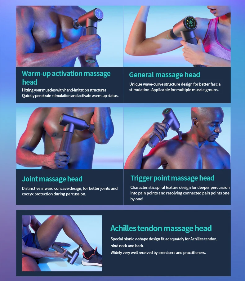 7.Configure with 5 diferent massage heads: General massage head, Articular capsule and joint massage head, Trigger points massage head, Achilles tendon massage head and Warm-up massage head