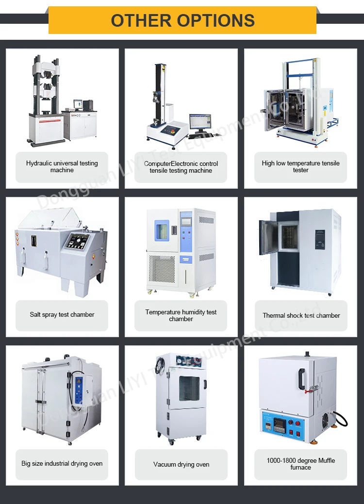 Liyi производит тестию машин, таких как климатические камеры, промышленные печи, универсальная разрывная испытательная машина, УФ камерах испытания вызревания, промышленные муфельные печи, бумажный мешок для упаковки Testrs, пластик, резина, клей тестеры и других испытательных оборудований.