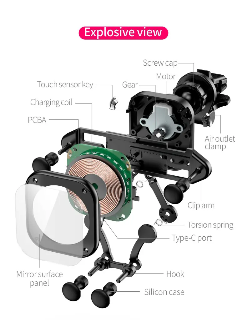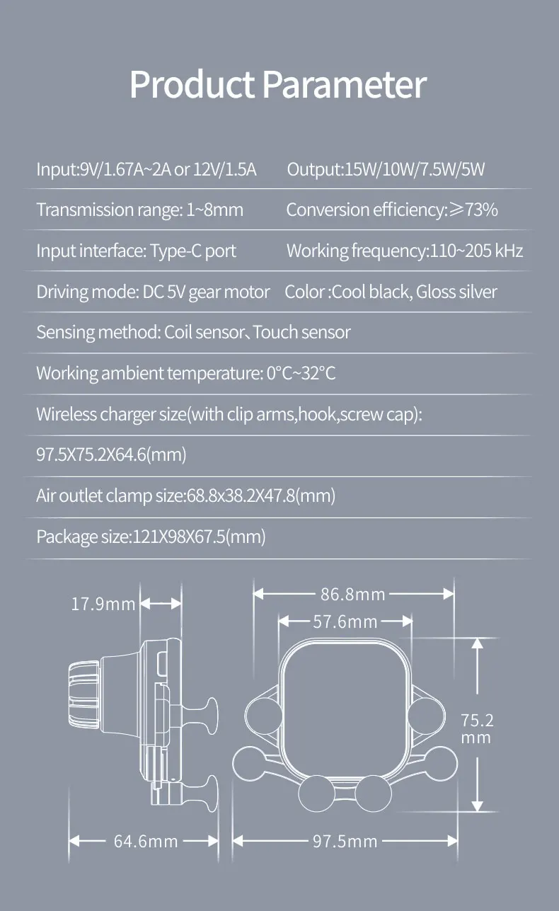 Пакет | Коробка, включая Беспроводное зарядное устройство, руководство пользователя, кабель Type-C, зажим для выхода воздуха |