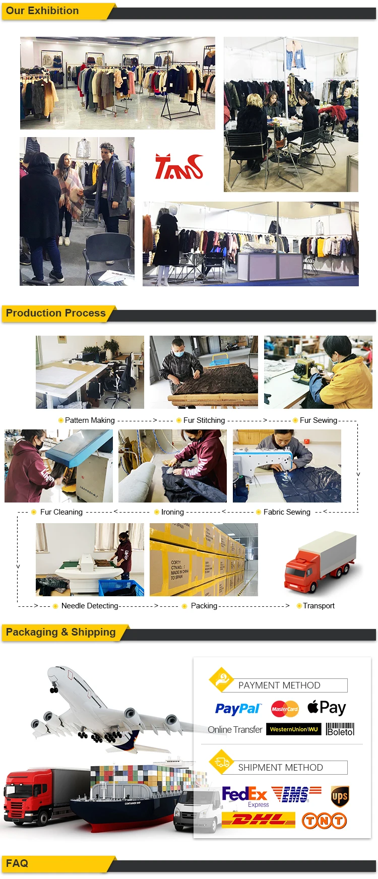 1. Можете ли вы сделать дизайн для нас? Да, мы можем сделать дизайн для вас. Ваши дизайны/Эскизы/фотографии также приветствуются. Мы можем обеспечить обслуживание OEM, а также обслуживание ODM. 2. Какой тип изготовления Вы хороши? Меховая резка, меховое шитье, двустороннее шитье, пуховое наполнение и т. д. 3. Как насчет образцов? Мы можем предложить образцы в течение 5-7 рабочих дней после оплаты. Когда вы размещаете большие заказы на нашу фабрику, мы вернем вам стоимость образца. 4. Какое у вас время выполнения заказа образцов? Если у нас есть запас, это занимает 1-2 дня. Если мы закажем материалы или аксессуары, это займет около 7-10 рабочих дней. 5. Каков минимальный заказ? Наш минимальный заказ составляет 2 шт. для некоторых стилей. Вы можете свободно связаться с нами для минимального заказа. Мы можем предложить вам один образец. Небольшое количество принимается для поддержки вашего бизнеса. 6. Каково ваше время доставки для производственных заказов? 5-30 рабочих дней. 7. Какой порт доставки? Обычно мы отправляем товары из порта Шанхая. 8. Каковы Ваши условия оплаты? T/T, L/C, MoneyGram, кредитная карта, PayPal, Western Union, наличные, Escrow. 9. Какое место занимает ваша фабрика? Наша фабрика расположена в тонгсяне, с удобной транспортировкой в Шанхай и Ханчжоу. 10. Каковы ваши основные продукты? Меховая одежда, кожаная одежда, пуховая одежда, пуховые одеяла и т. д.
