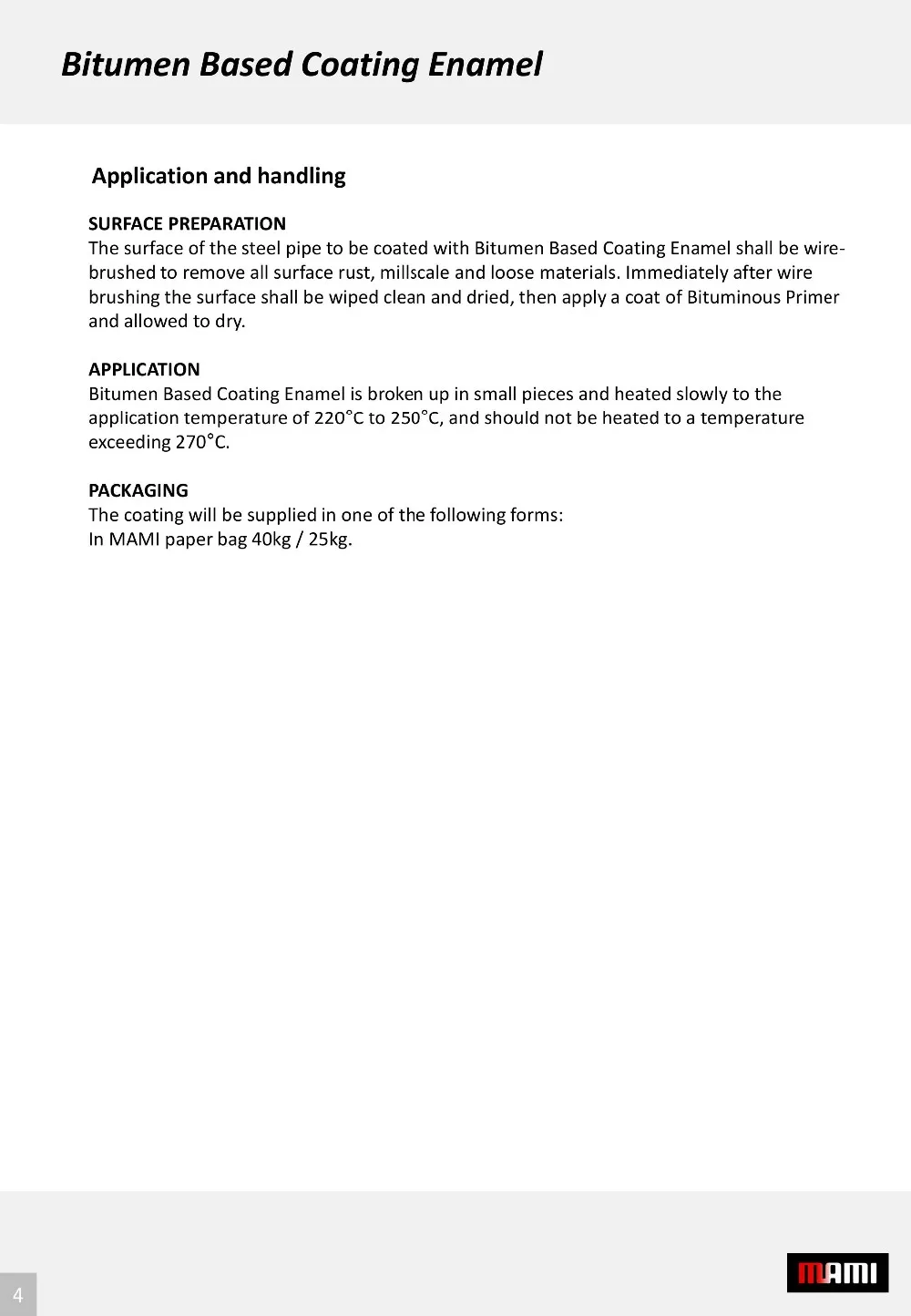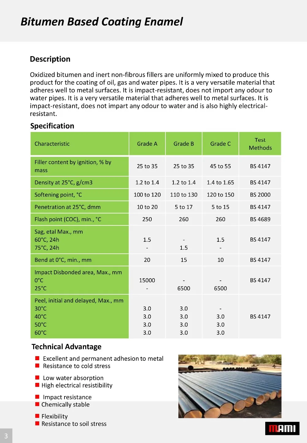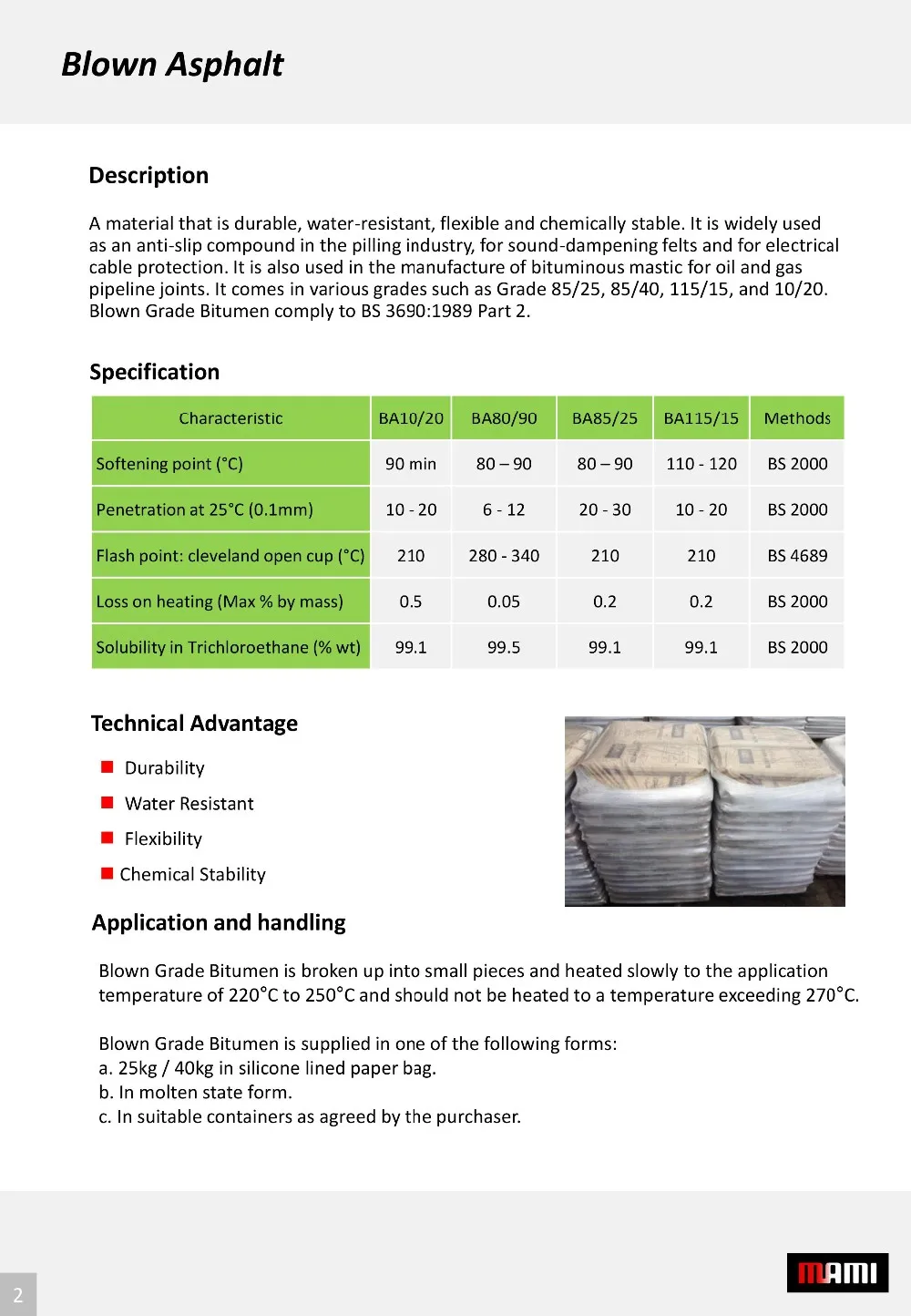 A material that is durable, water-resistant, flexible and chemically stable. It is widely used as an anti-slip compound in the piling industry, for sound-dampening felts and for electrical cable protection. It is also used in the manufacture of bituminous mastic for oil and gas pipeline joints. It comes in various grades such as Grade 85/25, 85/40, 115/15, and 10/20.