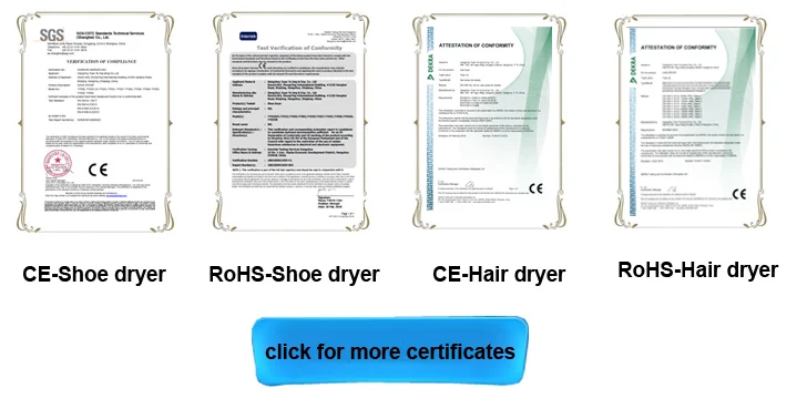 A: We have CE and RoHS certifications for hair dryer and shoe dryer issued by Dekra, from Germany. We are also open to apply for other certifications upon request after the order is confirmed.