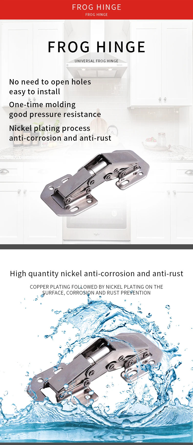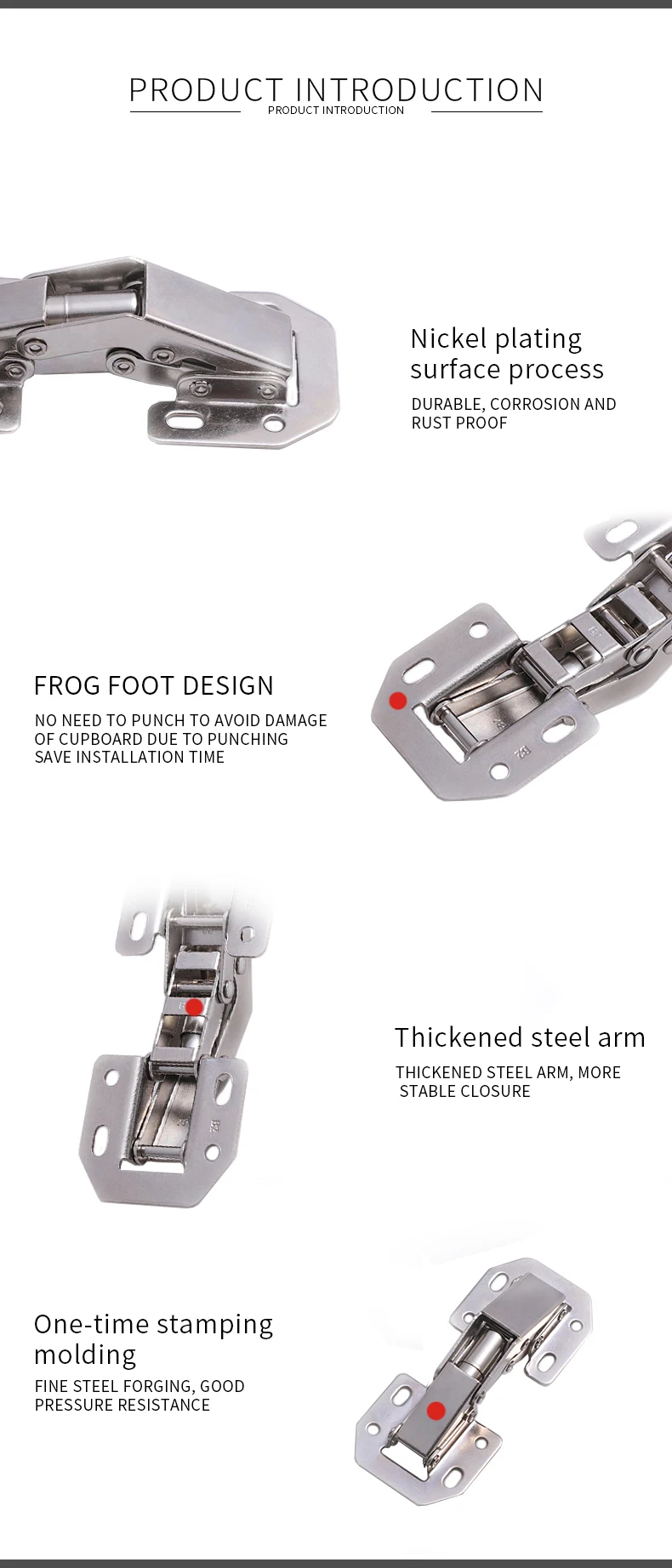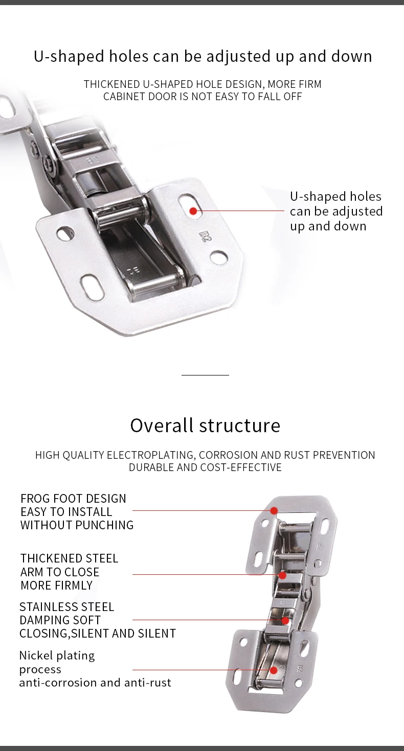 Widening manganese steel spring,can disperse force when the hinge closed. Strengthened spring, thickness 2.5mm instead of common one thickness: 1.2mm | |