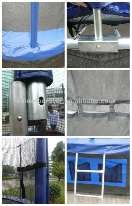 2.Black heavy-duty jumping mat is made from USA in a criss-cross weave,UV-resistant to protect against sun damage,V-rings attached with 8 rows of stitching.
