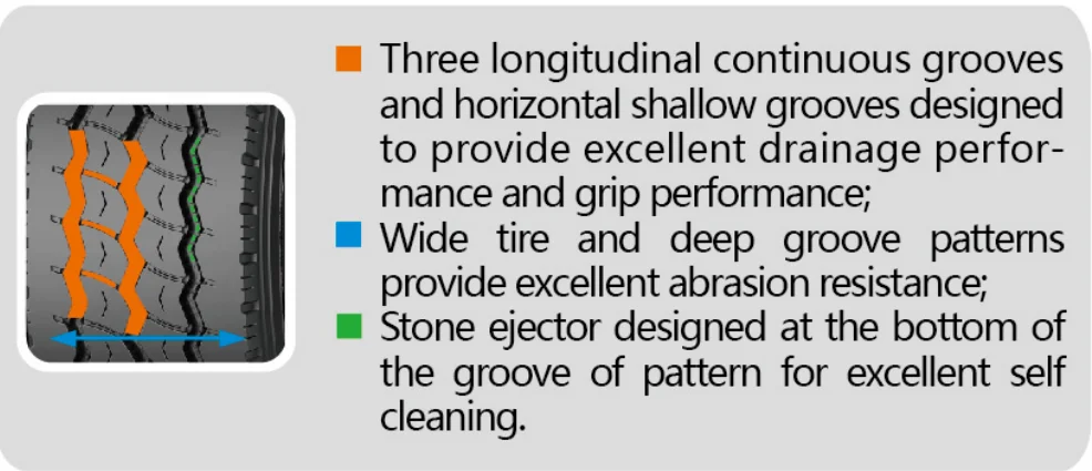 Sizes | Ply | Pattern | Load index | Speed level | Standard rim | Section width (mm) | Outer diameter (mm) | Design of tread depth(mm) |