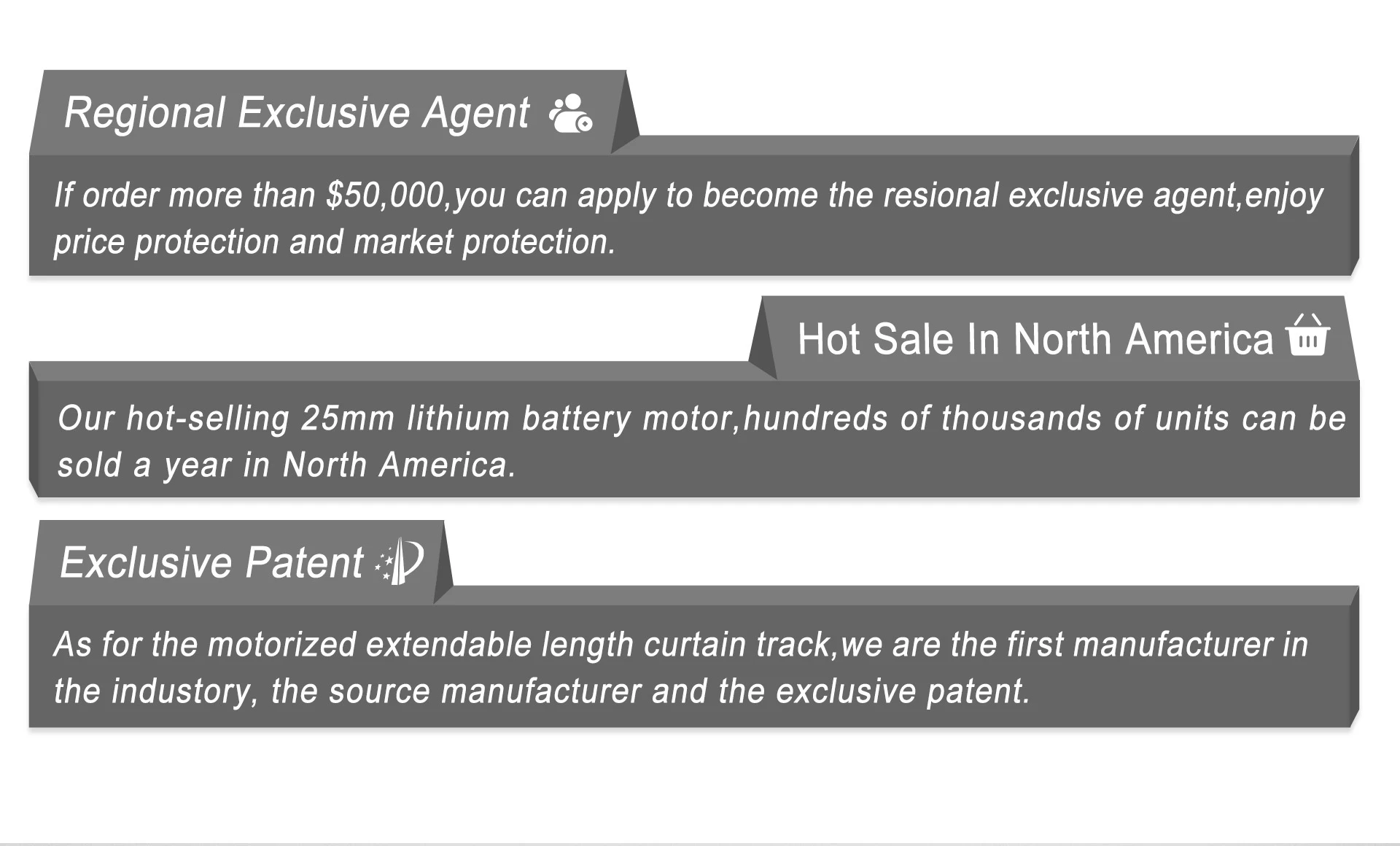 We produce and sell motorized drapery curtain drive ,motorized venetian motor,roller blinds motor,manual roller blinds clutch ,curtain track and accessories.