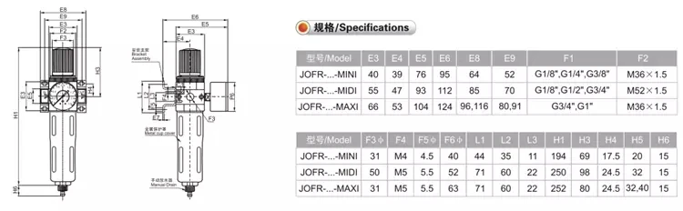 Features of Structure | Sintered filter with water separator;MINI/MID:Diaphragm type-regulator;MAXI:Piston regulator | |||||||||||||||