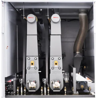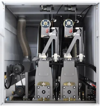 | Two sanding frame adopts eccentric spiral rubber rollers, with an advantage of convenient adjustment. The structure of double roller feeding makes is possible to processing short profile, min. length is 300mm, which can go through smoothly. | ![]() |