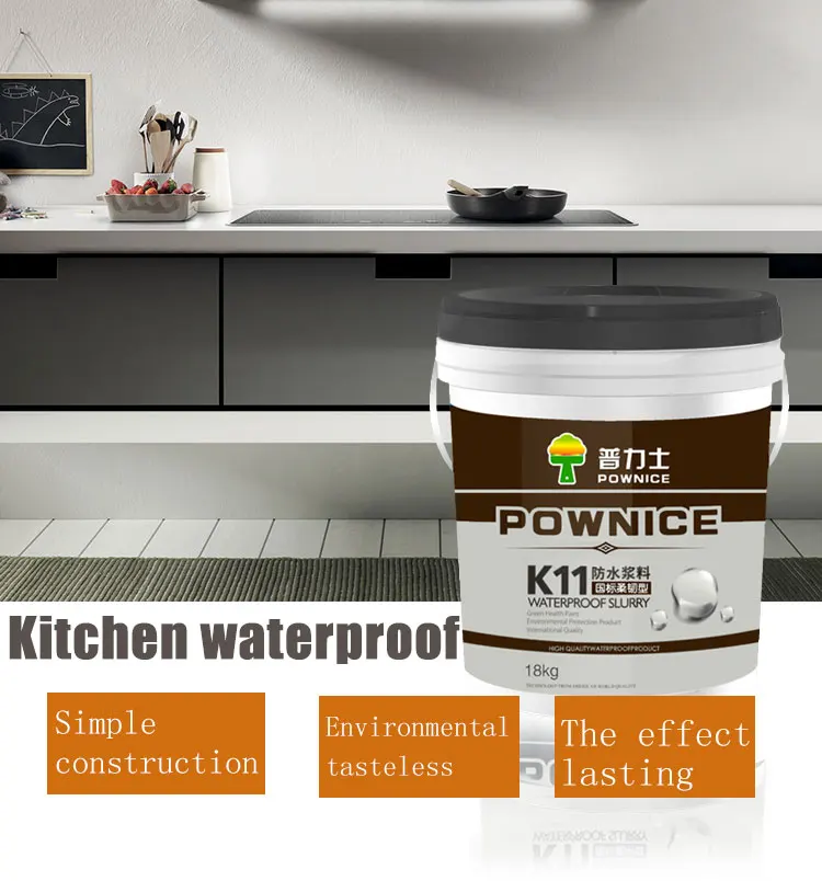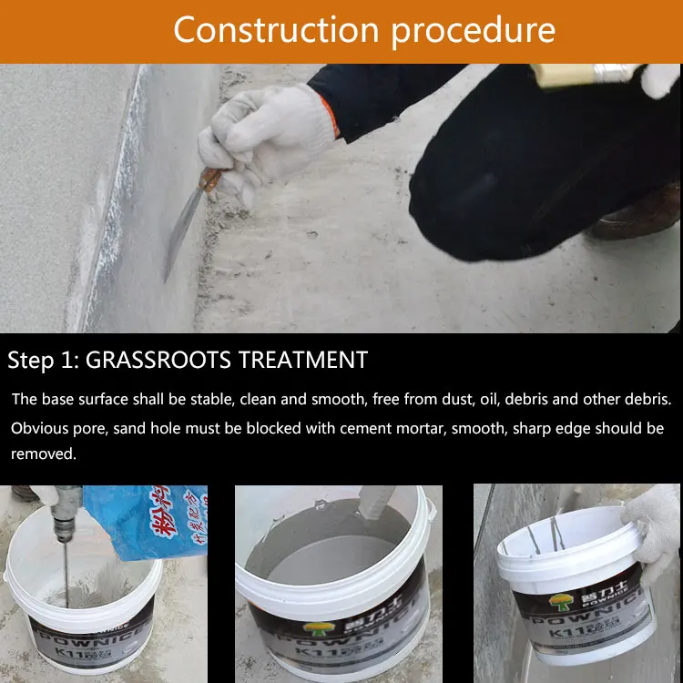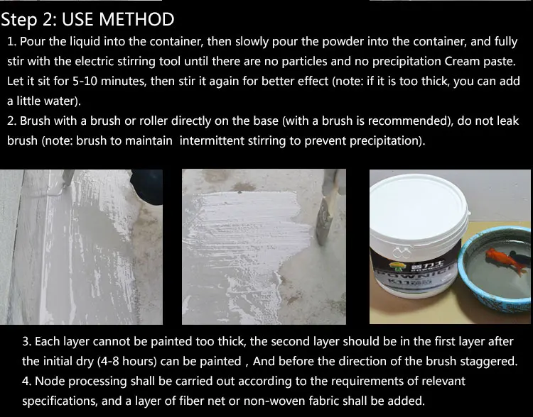 1. Non-toxic and odorless, environmentally friendly products 2. Able to cover the base surface micro-cracks, against a slight vibration and displacement of the base surface 3. Bonding properties in the wet base surface construction 4. UV resistance performance 5. Follow-up construction of plaster and paste tiles directly on the waterproof layer