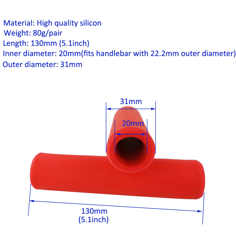 Specifications Material:Silicone Foam Sponge Length:130mm Inner diameter:20mm Outter diameter:31mm Fit handlebar diameter:22.2mm/0.87inch Color:Black/Red/Blue/Fruit Green/Fluorescence Yellow/Pink Net Weight:about 80g Suitable for most mountain bike and road bike Package included: 1 X A pair of bike grips 2 X Bar end plugs