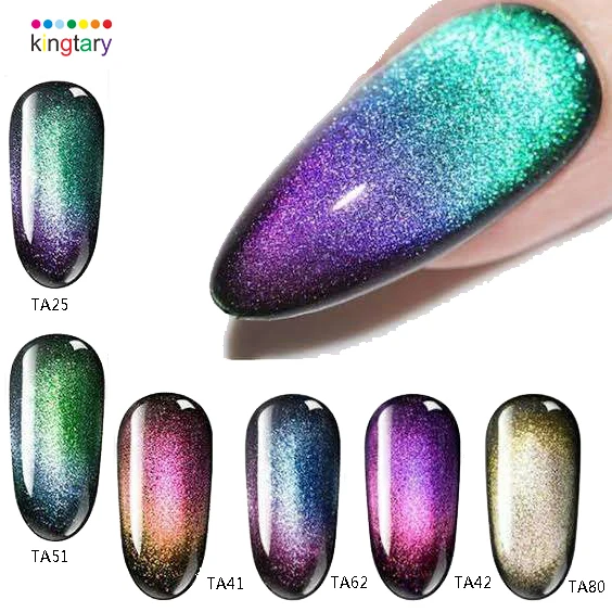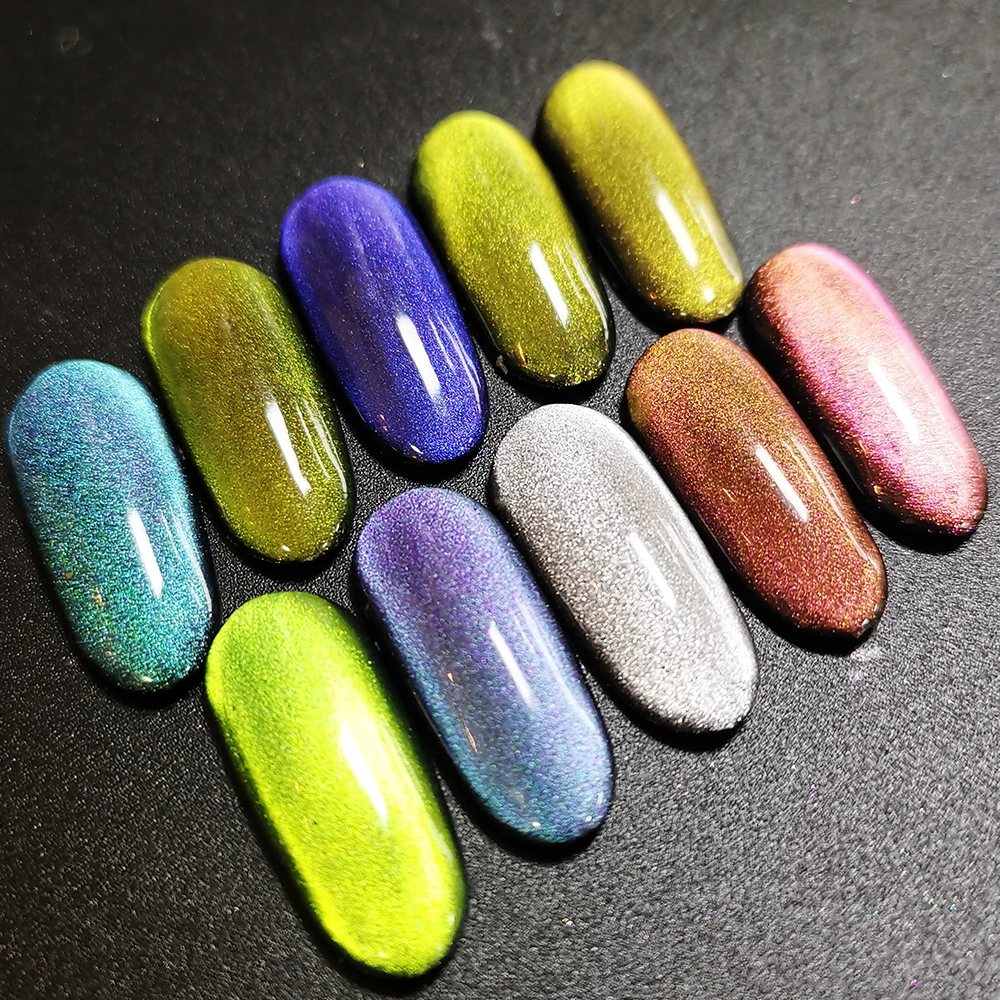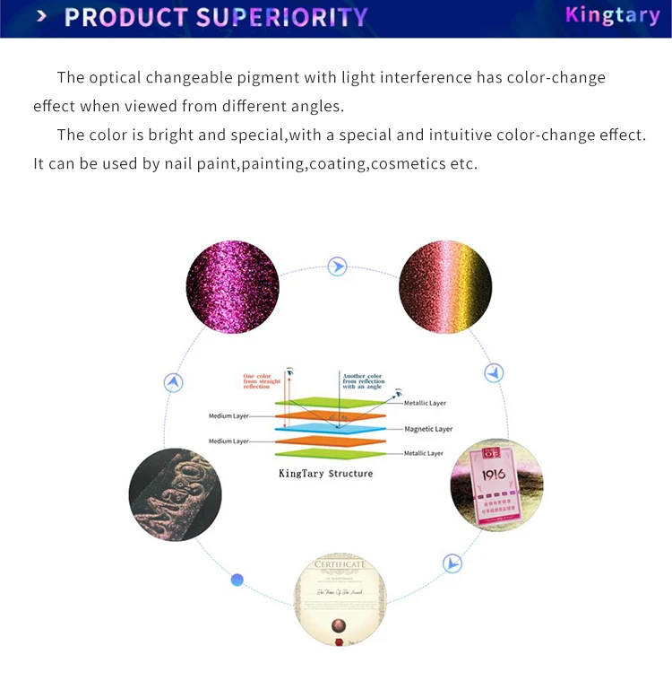 Eco-friendly Glitter Powder Nail Art 5D Magnetic pigment Flash Pigment is the latest patented product of Kingtary..The pigments have the functions of color changing and magnetic induction. The printed mater can produce double speciall effects-dynamic effect and color changing effect with different viewing angles. The process is more complex and has higher anti-counterfeiting value.it it can be used in eyeshadow . 5D Magnetic pigment is used PVD coating process, imitation A pigment made from a natural biological chromogenic system having an ultra-thin sheet structure and a co-color 8 main tones ,12 colors.