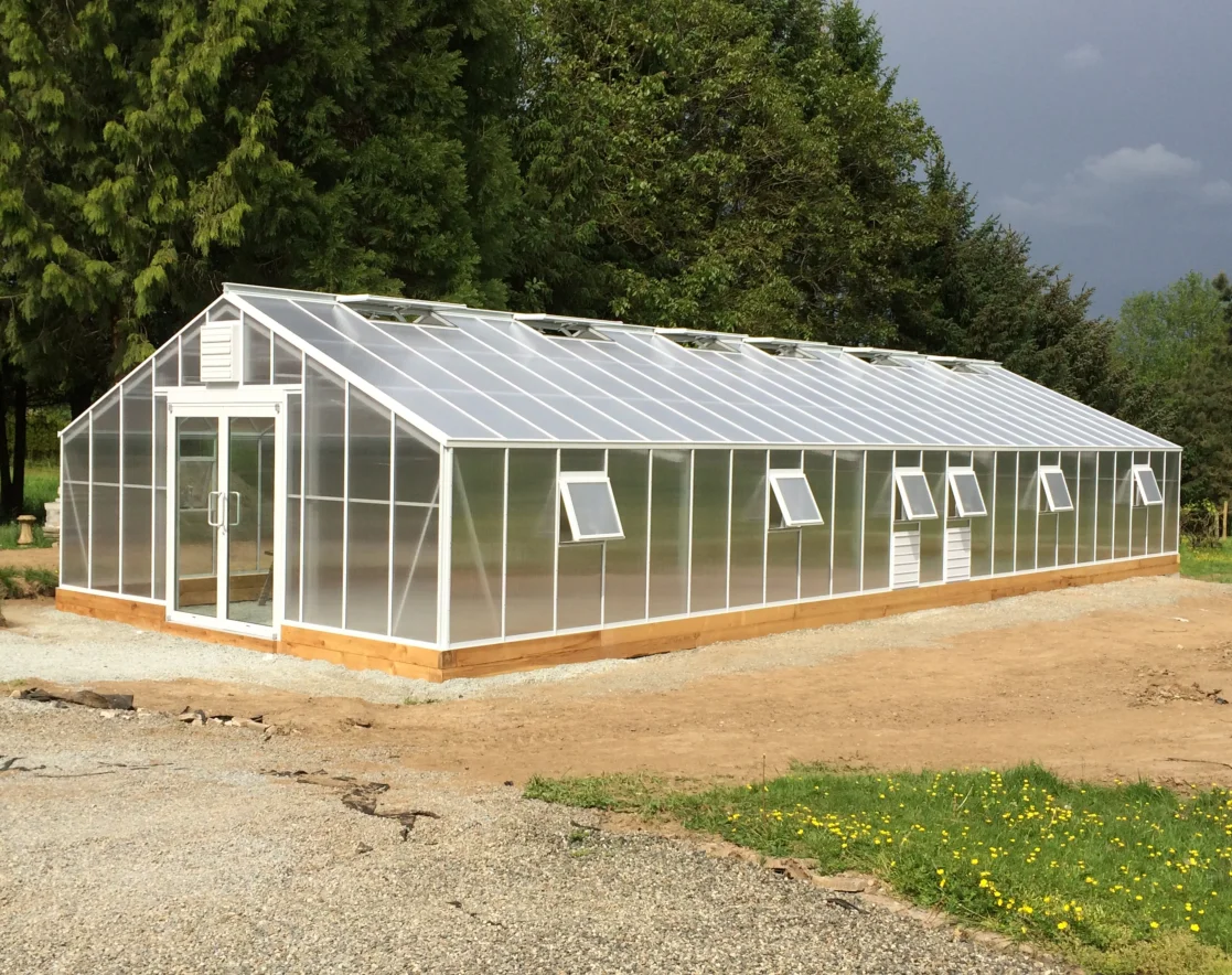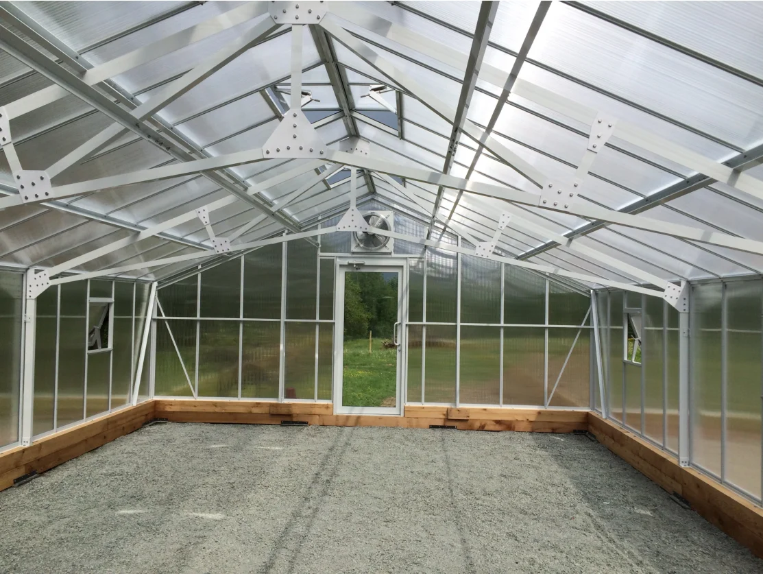 The skeleton of greenhouse adopts aluminum profile structure, which is strong and durable. The aluminum structure has strong corrosion resistance and it can be used for more than 30 years. The cover film is made of PC sheet or tempered glass, which has anti-ultraviolet and anti-drip function, and it is very economical.