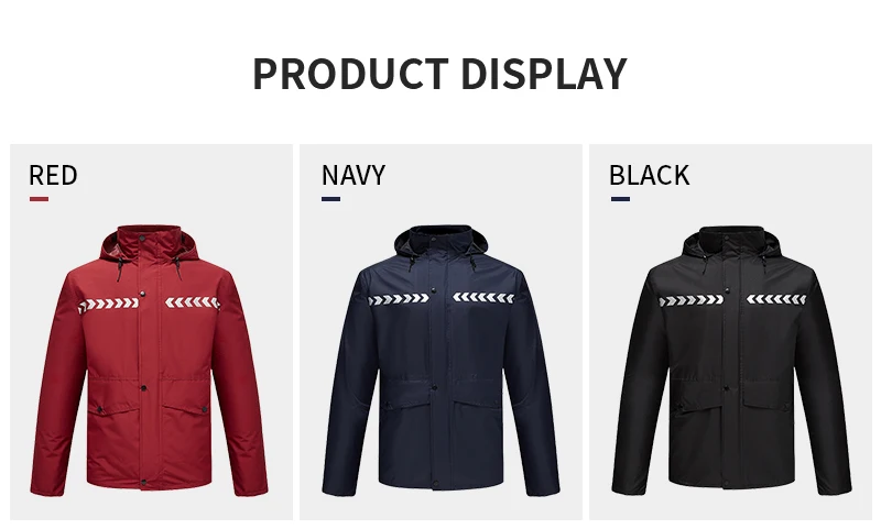 Design | HOOD hidden in the collar , hooded, reflective tape, Side pockets or customized |