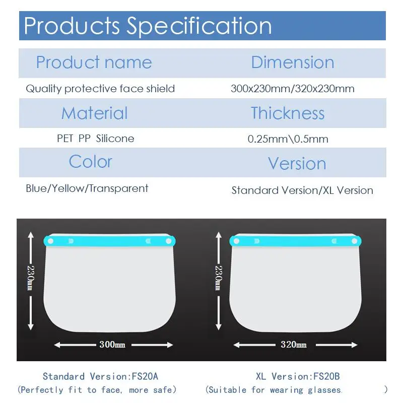 FAQ: 1.Q: Are you manufacturer or trade company? A: We are the manufacturer specialized in all kinds of plastic products including face shield. 2.Q: How can I get the samples? A: If you need some samples to test, The sample is free below 3pcs, but you will pay for the transportation freight of samples . 3.Q: How much the transportation freight of samples? A: The freight depends on the weight and packing size and your area. 4.Q: How long can I expect to get the sample? A: The samples have stocks. The samples will be sent via express and arrive in 7-10 days. 5.Q: Can we have our Logo or company name to be printed on your products or package? A: Sure. your logo can be put on your products by hot stamping, printing, UV coating, Embossing, silk-screen Printing or Sticker. 6.Q: How to order? A: Please send us your purchase order by Email or you can ask us to send you a perform invoice for your order.