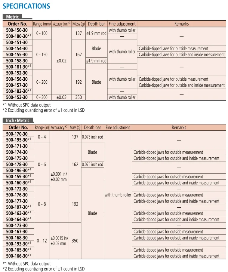 • An ABSOLUTE electromagnetic induction linear encoder system is incorporated. • New ergonomic design with finger rest. • The ZERO/ABS button allows the display to be Zero-Set at any slider position along the scale for comparison measurements. This button will also allow return to the absolute (ABS) mode and display of the true position from the origin (usually jaws closed point). • Large and clear LCD readout. • Smooth slider movement makes for comfortable operation. • Extended battery life of Approx. 5 years due to low current integrated circuit (except for 0 - 300 mm/0 - 12 inch models). • Allows step measurement. • Carbide-tipped jaw calipers are optimal for rough nished parts, castings, grinding stones, etc. • Allows integration into statistical process control and measurement systems for models with measurement data output connector.
