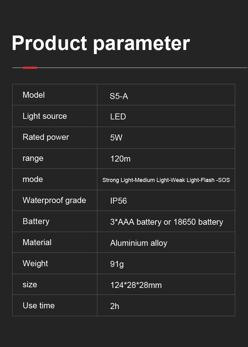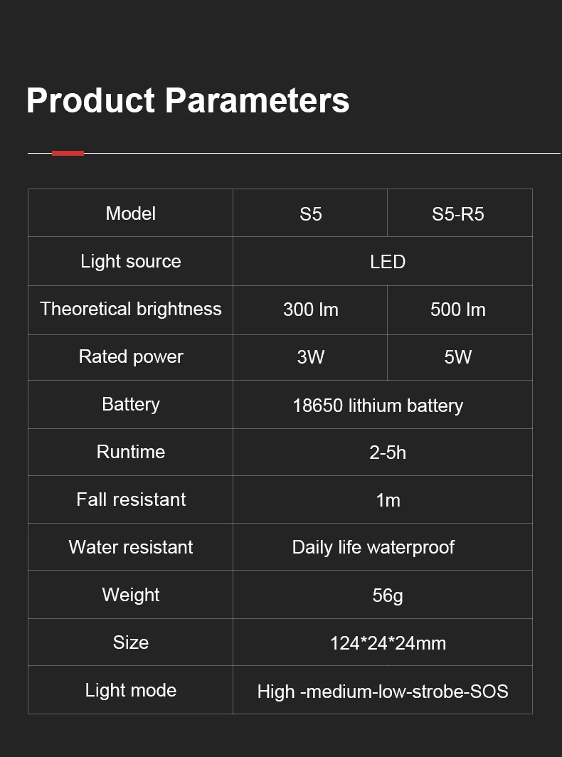 Modes | Modes:5modes front light (High>Medium>Low>Strobe>SOS) |