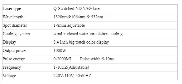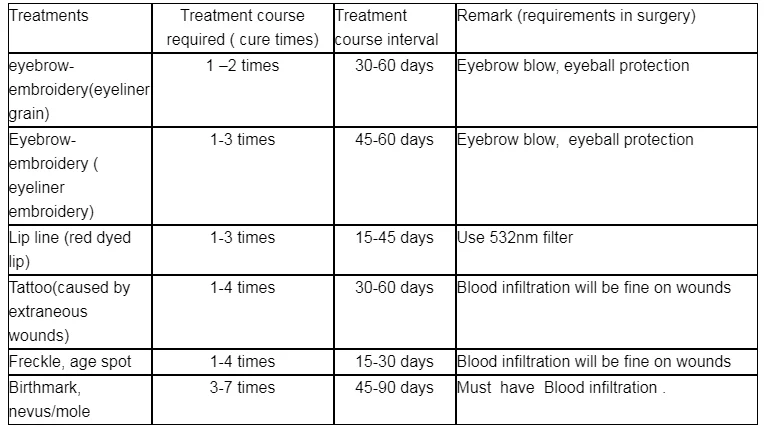 Application: The system gem-adjusting Q switch can effectively cure the mixed pigments by pigment precipitation of extraneous source with pathological pigment change of endogenous source, inclusive of erroneous dark eyebrow-embroidery, lip embroidery, lip-soak, eye line-embroidery, lip-line,tattoo (inclusive of tattoo by extraneous wounds), pigment precipitation by sensitive source, freckle on female\'s face (male\'s), coffee spot, old age spot, black mole, and birthmark in black, blue, purple, brown, red and etc.Treatment course for different illness case as follows: