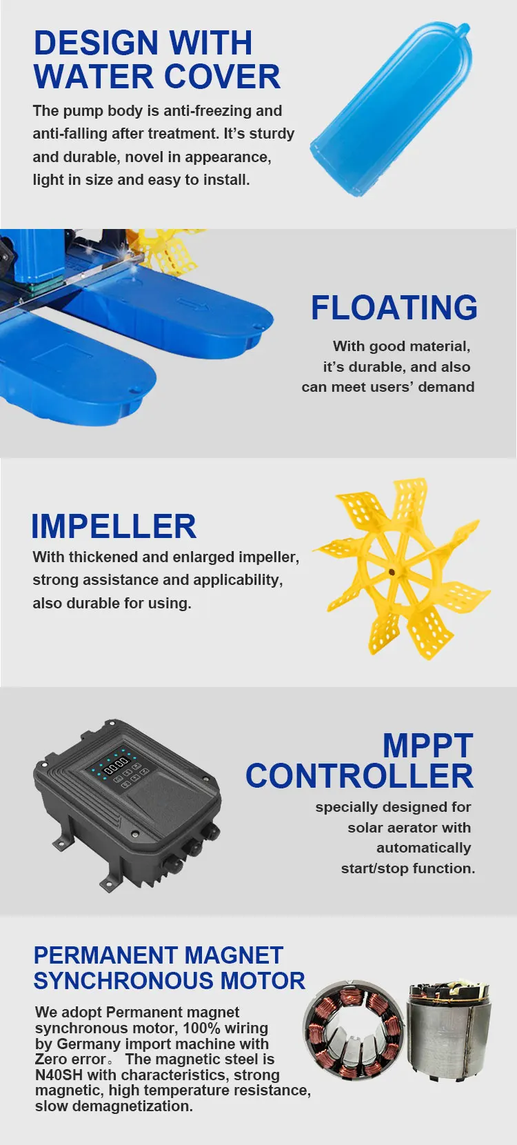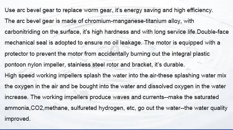Model | Voltage (V) | Power (w) | Voltage Range (V) | Impeller | Aerobic Capacity (KG/H) | Aeration Range (m2) |
