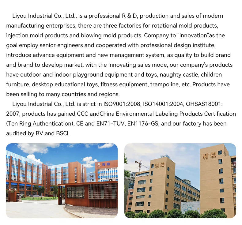 Q5: Do you have any certificate? We have EN71-TUV, EN1176-GS, CPC and ASTM for many indoor and outdoor products, factory has got ISO9001, ISO14001, and passed BSCI factory audit.