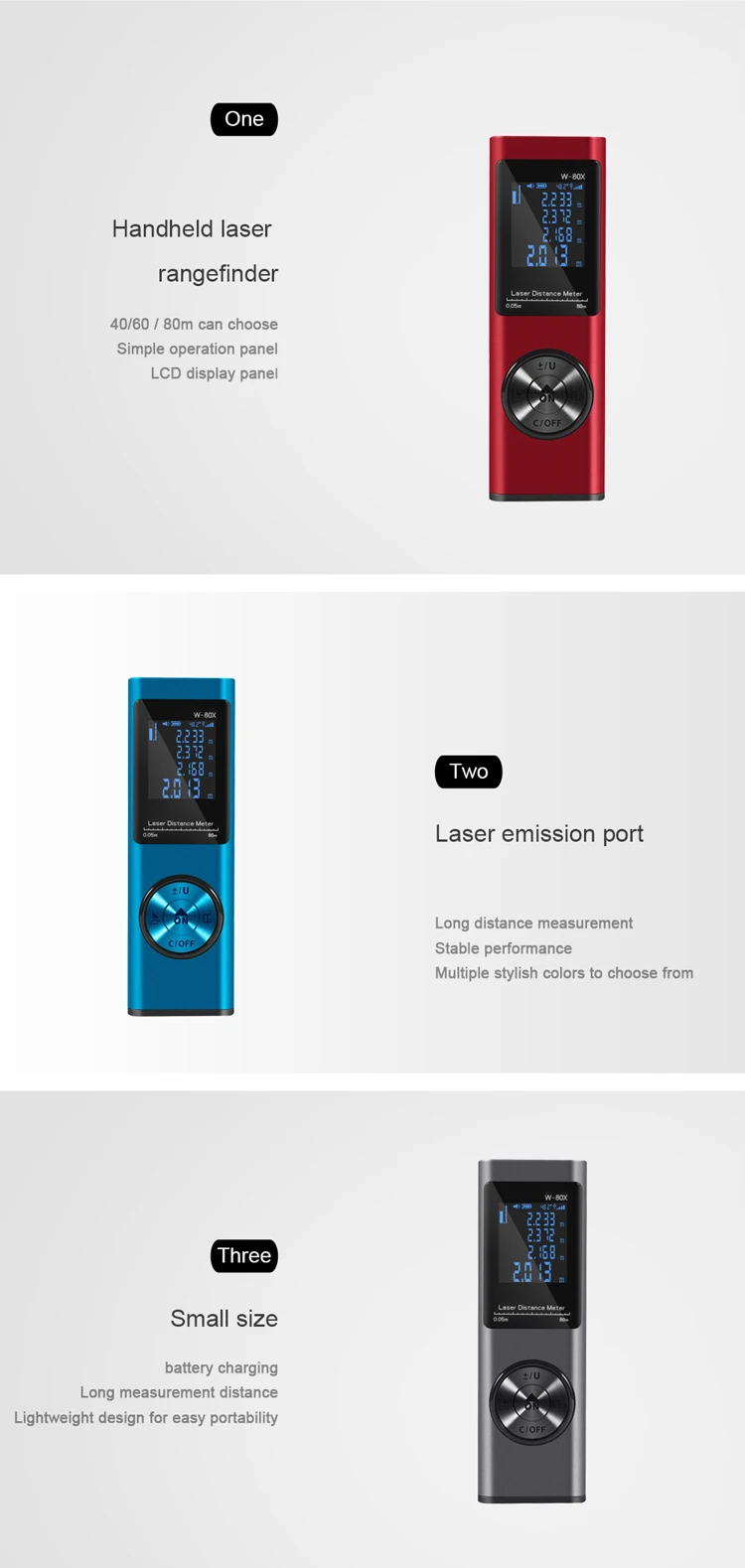Model Number: W50X Product volume: 101*30*18mm Unit weight: 65g Made in China Type: Handheld Laser Rangefinder Measuring range: 0.05-40 meters Accuracy: +/- 2mm Working temperature range: 0℃-40℃ Storage temperature range: -25 ℃ -60 ℃
