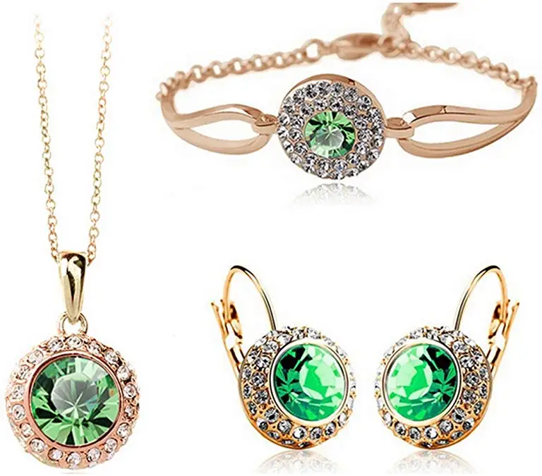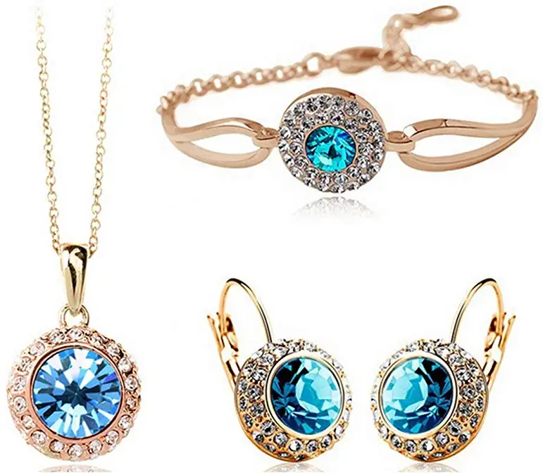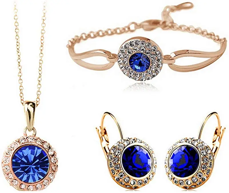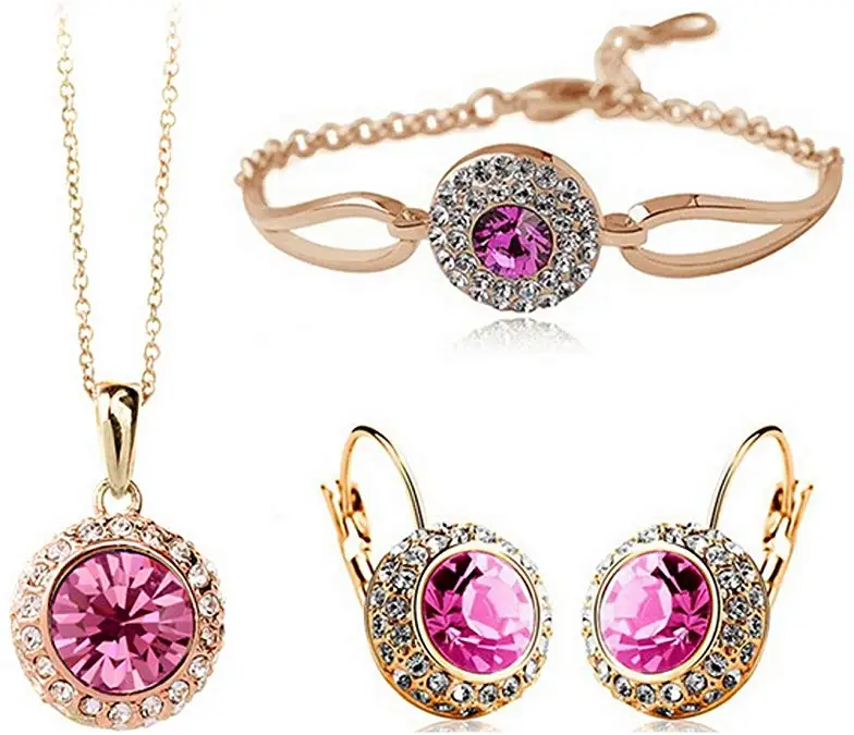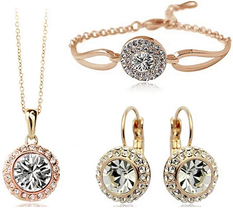 Women Fashion Jewelry 18K Gold Plated Crystal Round Shaped Necklace Bracelet Earrings Set