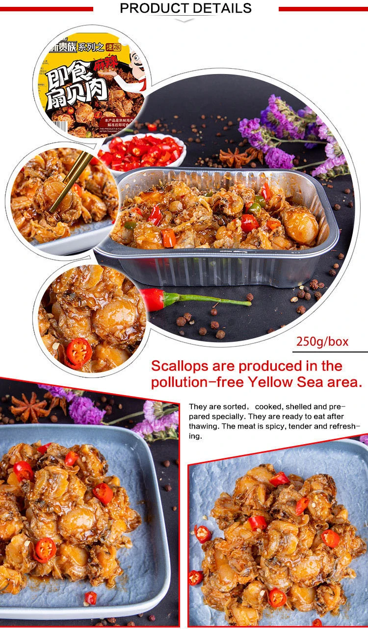Scallops are produced in the pollution-free Yellow Sea area. They are sorted, cooked, shelled and prepared specially. They are ready to eat after thawing. The meat is spicy, tender and refreshing.